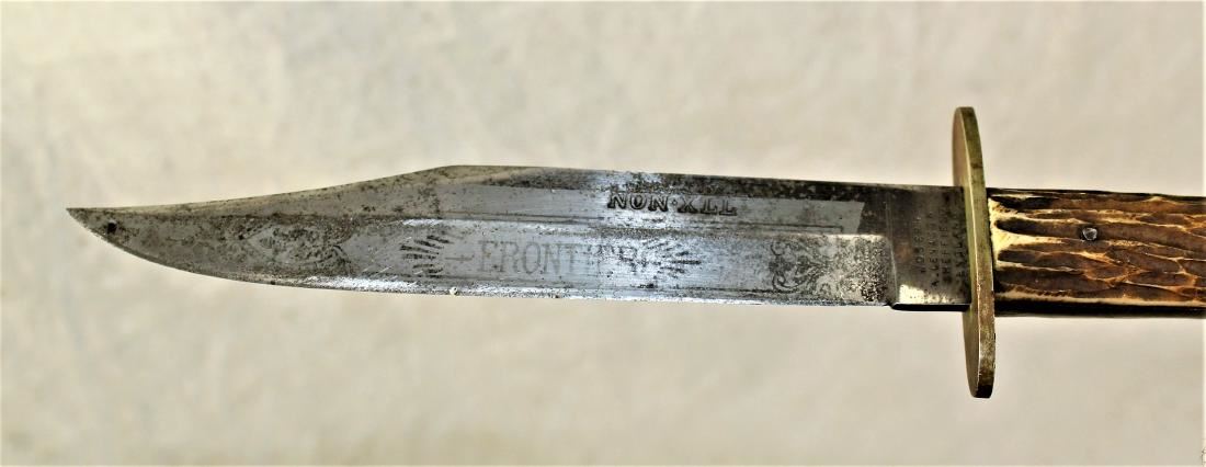 Three ranch used knives with stag handles. 1) 9" illegible mark with attractive studded sheith. 2) 11" Joseph Allen & Son, Sheffield England with acid etched blade reading " FRONTIER NON-XLL". 3) 8 1/2" clippoint blade with illedgible mark.