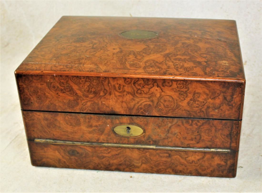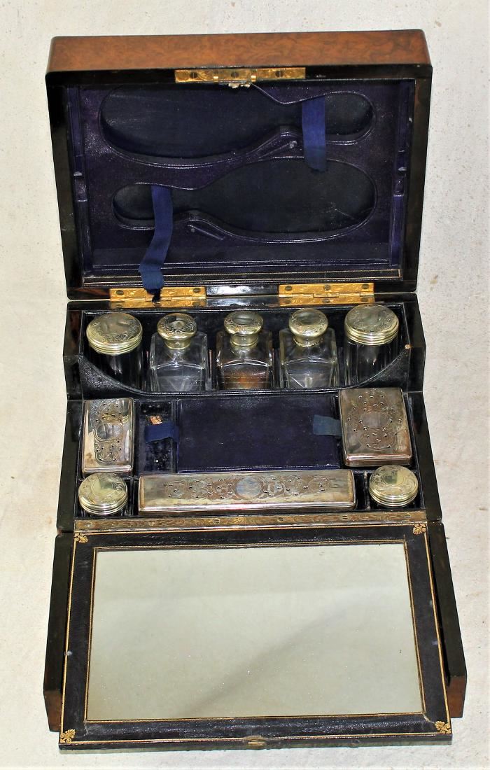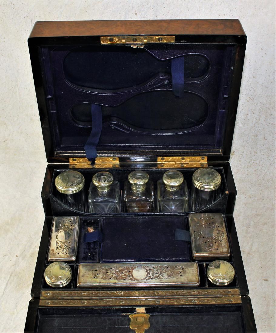 Beautiful burl walnut box filled with women's toiletry accessories, mirror, and jars with sterling silver lids.