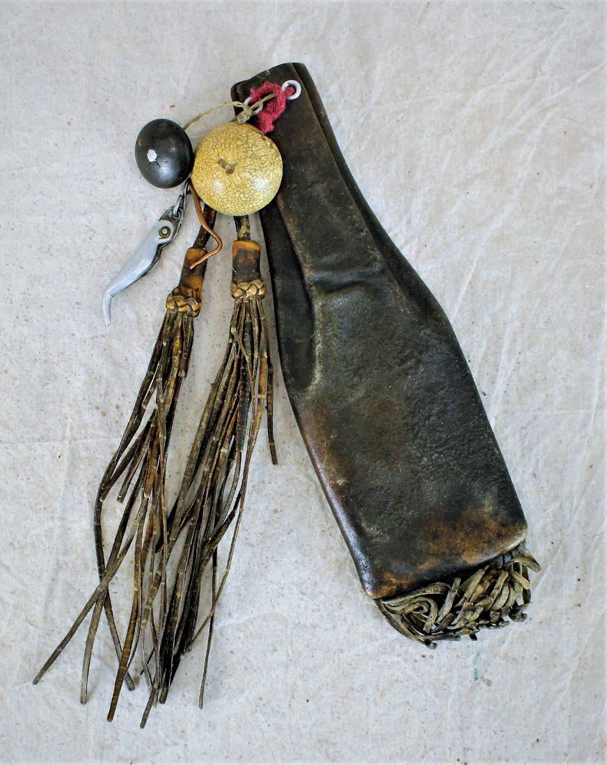 Intriguing fringed leather pouch with decorative long fringe, and variety of fobs and tools.