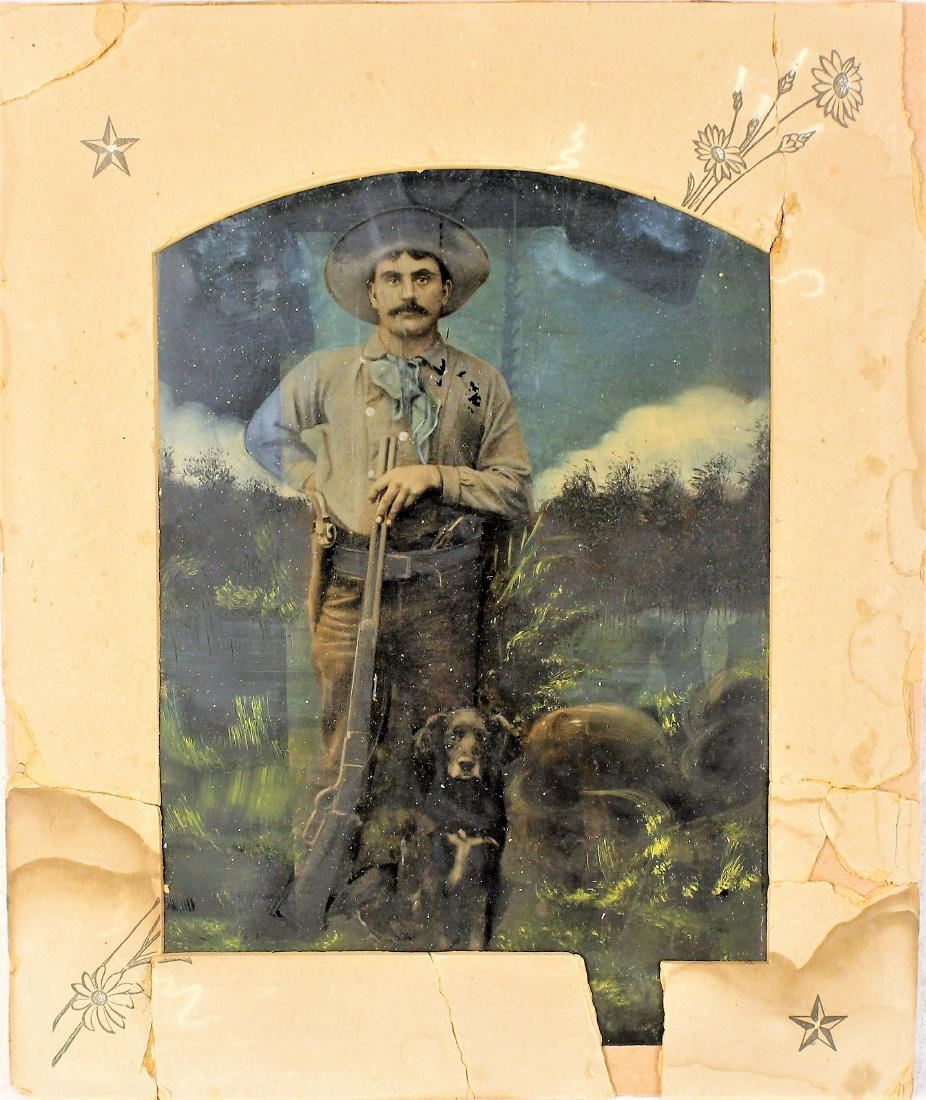 Terrific uncommonly large colored tintype image of armed cowboy posing with his dog while holding his 1878 Colt and 1876 Winchester rifle. Showing great coloration and measuring 7"x 9".