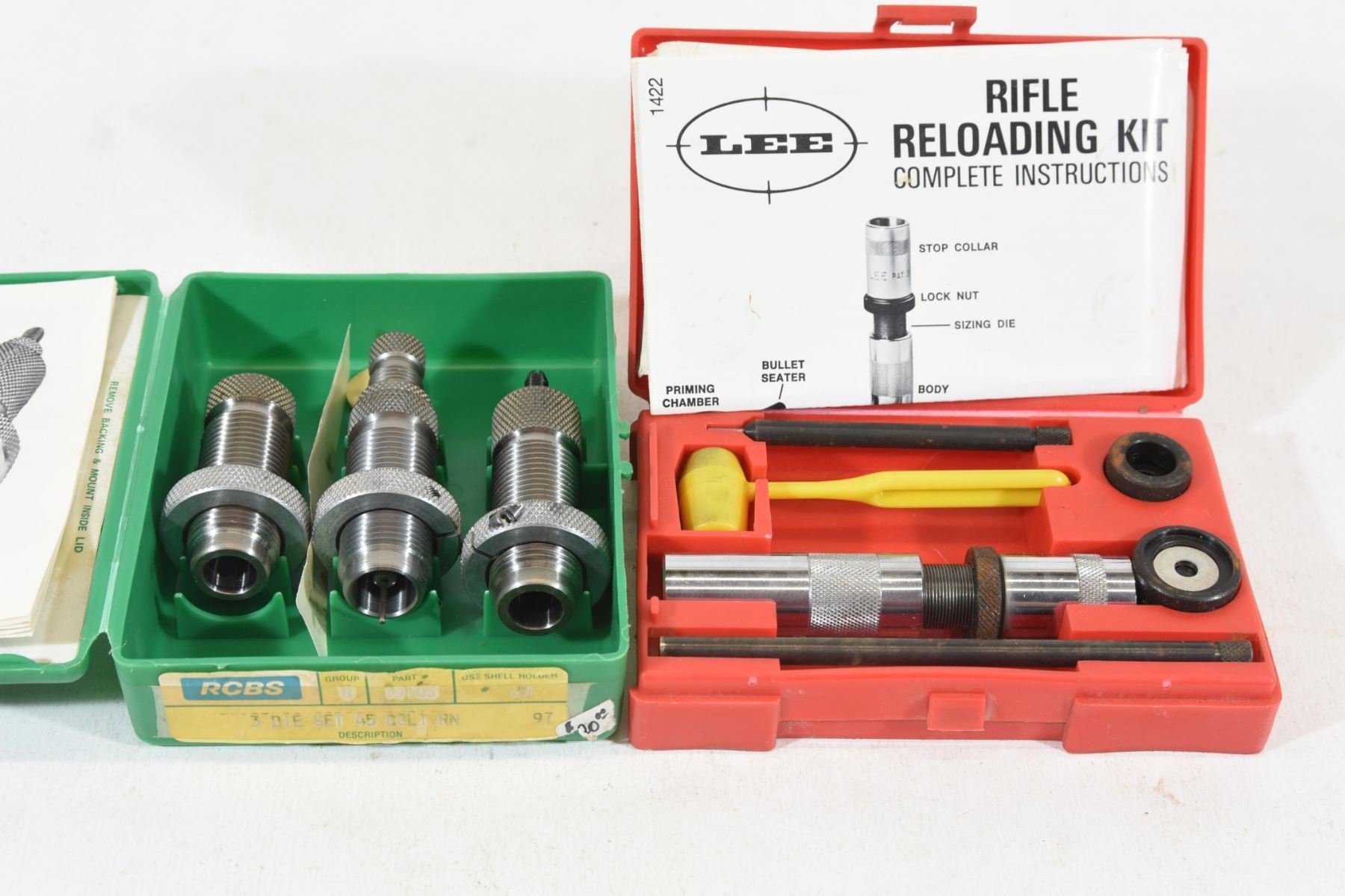 1) RCBS 3 pc. die set for .45 Colt 2) Lee reloading kit for 25-06 Remington