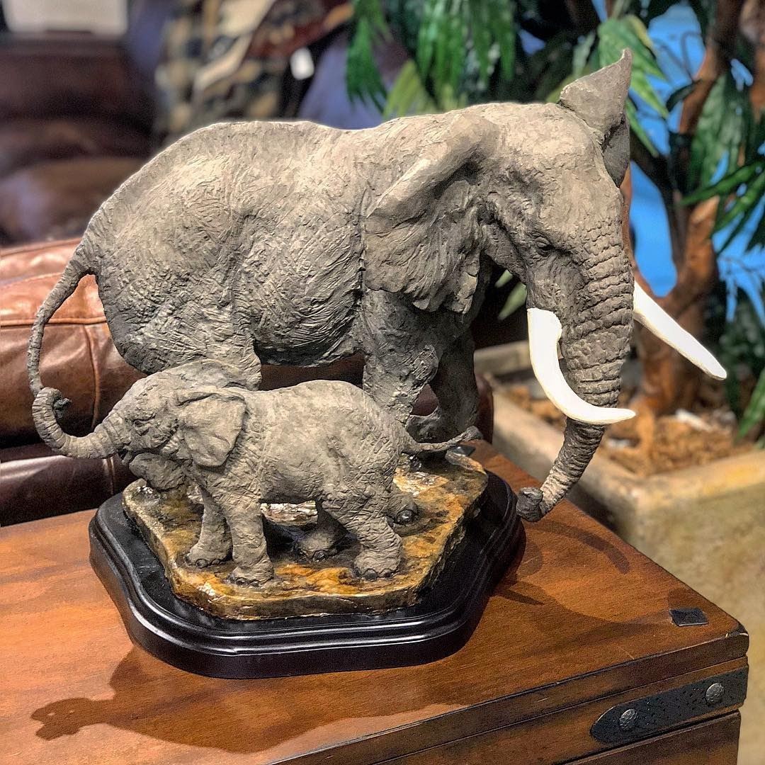The African mother elephant, largest female land mammal on the planet is the inspiration for Lorenzo Ghiglieri’s “A MOTHER’S INSTINCT” PAINTED BRONZE. The African Elephant has a longer pregnancy than any other mammal: almost 22 months. Cows usually give birth to one calf every two to four years. Maybe that is why the elephant-bond between mother and child is so strong, and why there is no other primal force as powerful as an elephant mother's instinct. Lorenzo is known as a representational sculptor of Eskimo, Indians, and wildlife - modeling in a style he relates to, baroque realism, in a language all can understand. Commissions have included life-sized bronzes of an eagle and a striding Abraham Lincoln, as well as "The Genesis of Love." Ronald Reagan was also presented with a Ghiglieri statuette. Minimum Bid: $3000.00