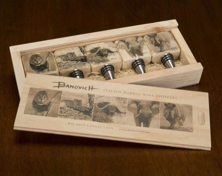 The JOHN BANOVICH WILD ACCENTS-BIG FIVE AFRICAN COLLECTION-WINE STOPPERS are hand printed John Banovich images on Italian tumbled marble wine stoppers. Each wine stopper is quarried, cut and tumbled in Europe from the highest quality marble. full wine stopper sets come in a pine display box. Minimum Bid: $150