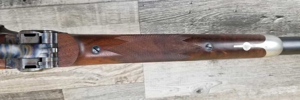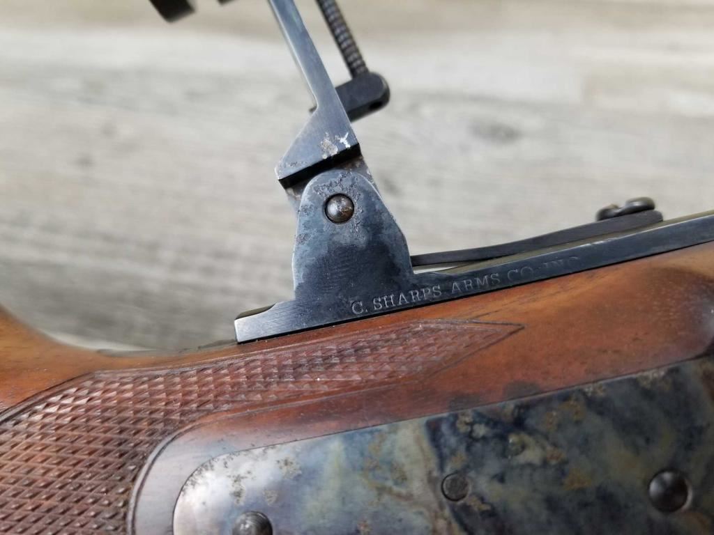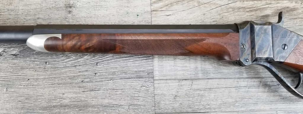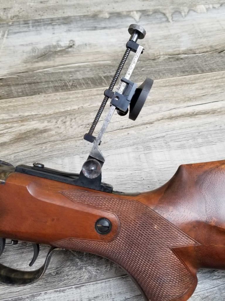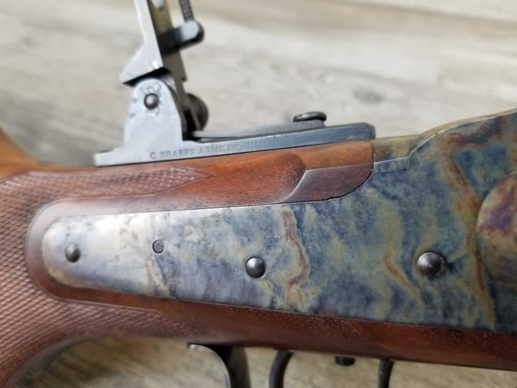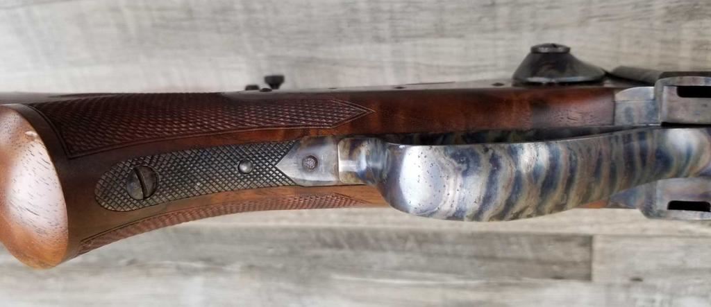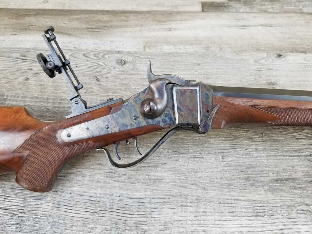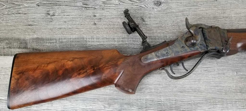 BEAUTIFUL WOOD. HALF ROUND BARREL. SET TRIGGER. BEAUTIFUL CASE COLORING. REAR SIGHT, HIGH END VERNIER. SIGHTHAS HAD SOME RUSTING ISSUE. ALSO SOME LIGHT PITTING ON RECEIVER. MINT BORE.
