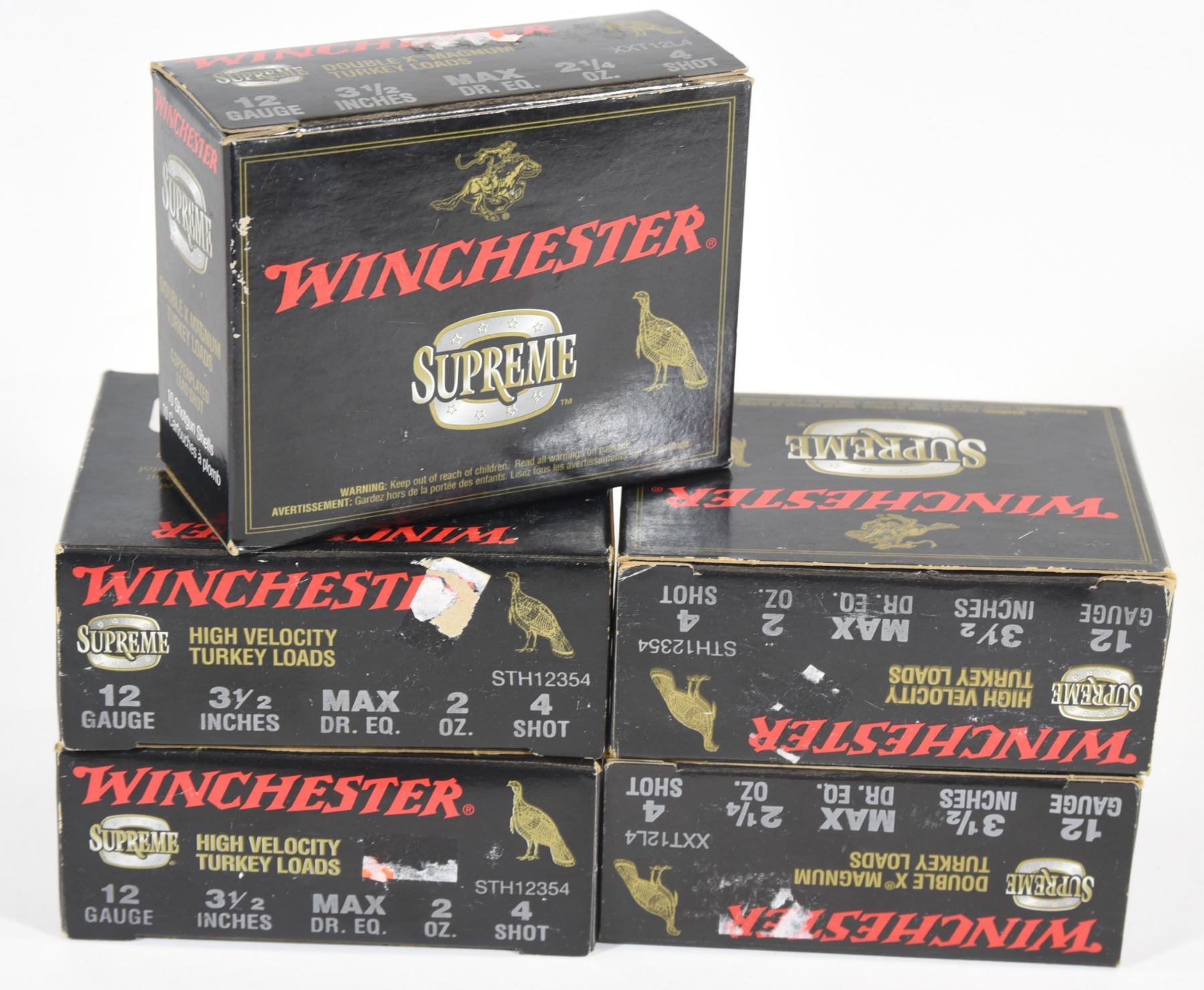 Three 10 round boxes of Winchester High Velocity 12ga 3.5"#4. Two 10 round boxes of Winchester Supreme Double X Magnum 12ga 3.5" #4.