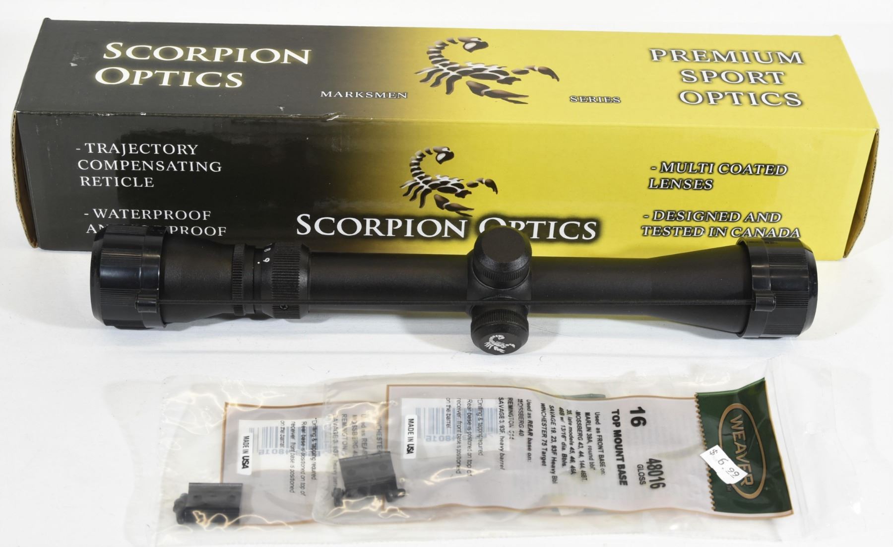 Scorpion 3-9x32 said to be new, comes with 2 pc. Weaver scope mount6 #48016
