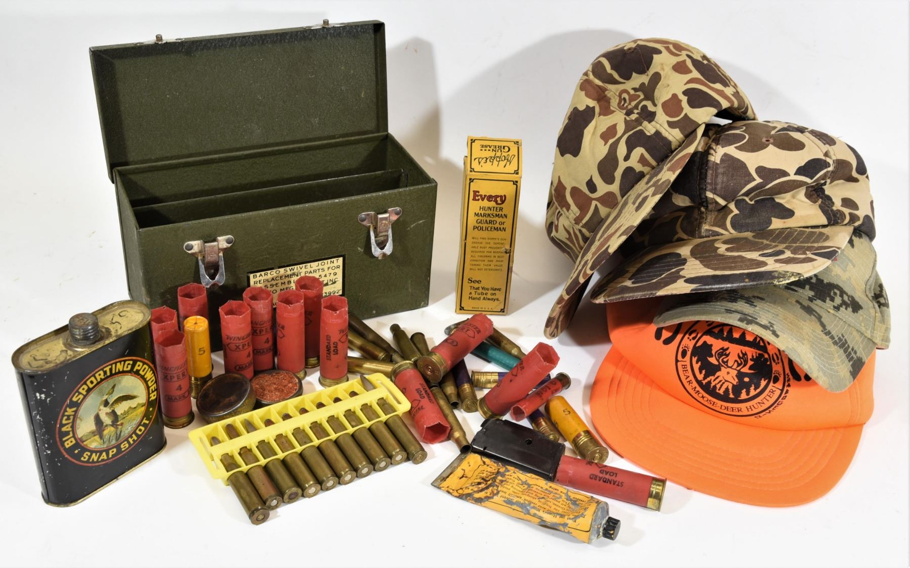 Collectable C-I-L black powder tin, FFG with some powder, 4 previously worn hats, metal can with 6 rounds 8mm, 1 round 6.5mm, 1 round 30-06, 2 unknown rounds, 3 rounds 410, 2rounds 20 ga. paper, 1 round 32 short, 2 unknown rounds, 2 vintage primer tins (one has 15 primers in it), 5 pieces 30-06 brass, 14 spent 12 ga. shells, 1 unknown .22 cal. magazine, 2 tubes vintage Hoppe's gun grease.