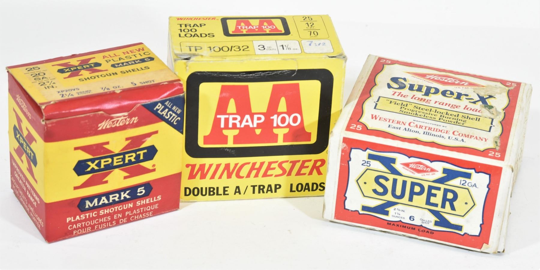 20 round box of Western Xpert Mark 5 20ga 2 3/4" #5 with an extra 5 rounds of Express Power Piston 3" #4. Full box of Winchester AA Trap 100 12ga 2 3/4" #7.5. Full box of Western Super-X Long Range Load 12ga 2 3/4" #6.