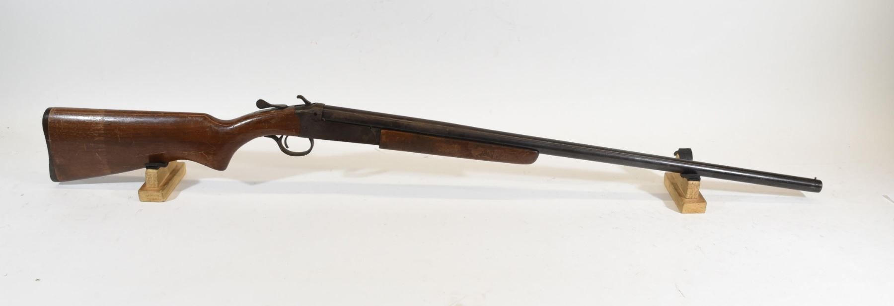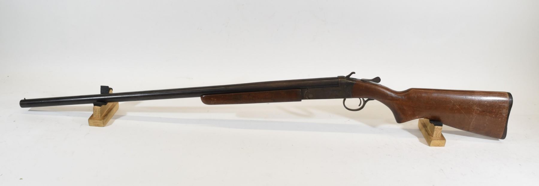 Non-restricted, single shot, 12Ga x 2 3/4", 30" barrel with fixed full choke, SN 68578. Wood has dents, marks and scratches, bluing turning brown, bore excellent.