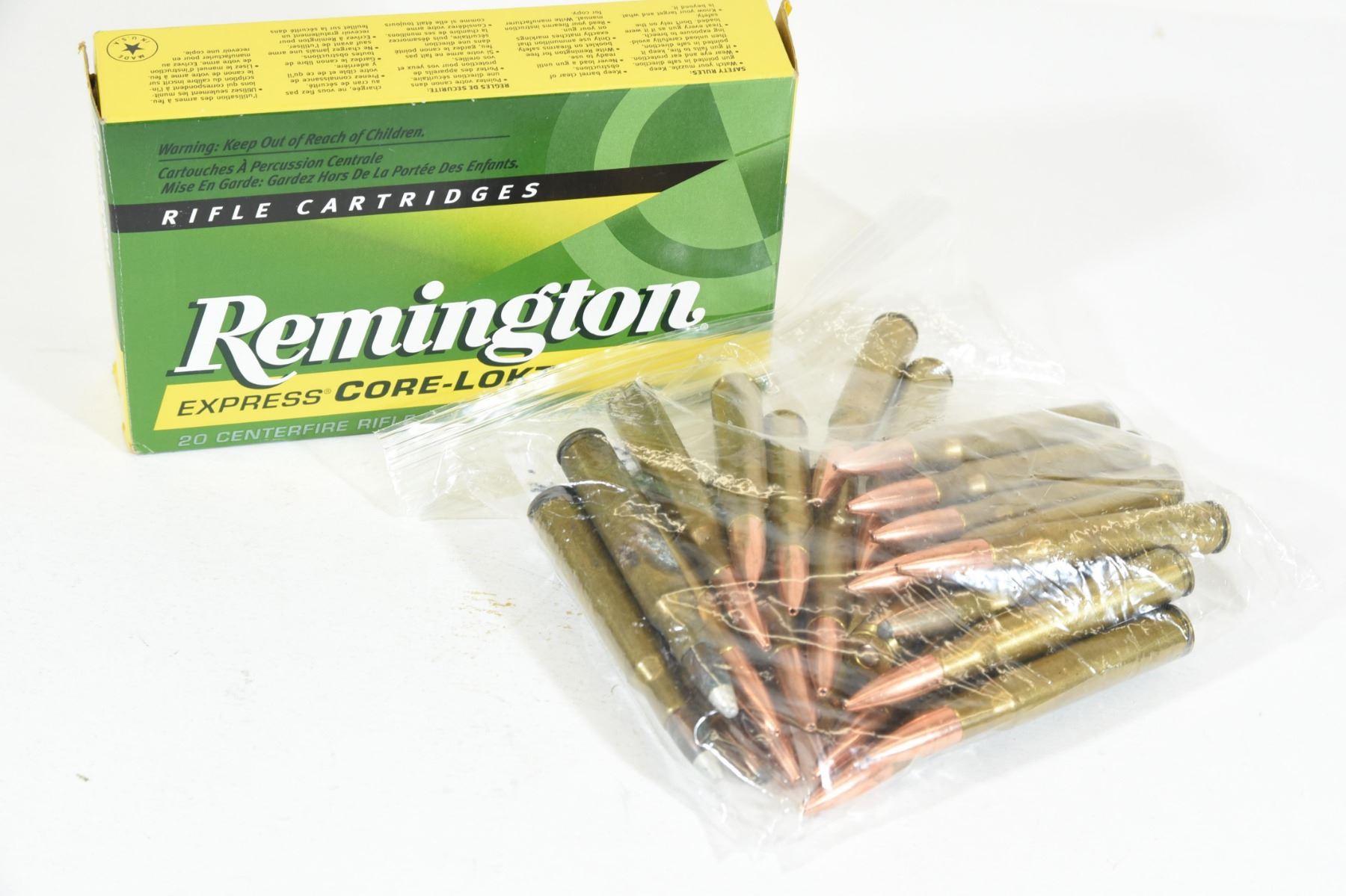 One 15 round box of Remington Express Core-Lokt 30-06 SPRG 180gr Core-Lokt SP ammunition. Bag of 24 loose rounds of 30-06 SPRG ammunition.