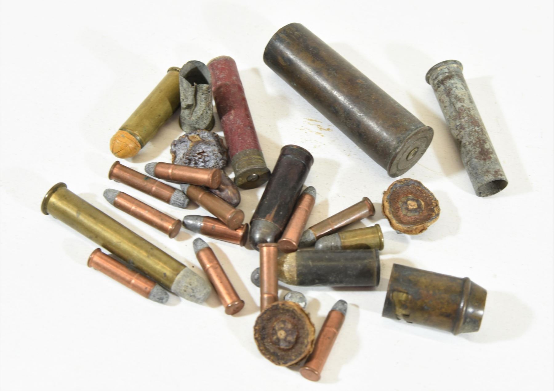 1 rnd. 38-55, 1 rnd 44-40 shot, 1 rnd. 32 S & W, 10 rnds. 22 cal. WRF, 1 rnd. 410 2 1/2", 2 unknown rnds., 1 rnd. 25 short, 2 pcs, unknown brass 1 is damaged, 3 unknown shell pieces, 1 pc. 10 ga. brass