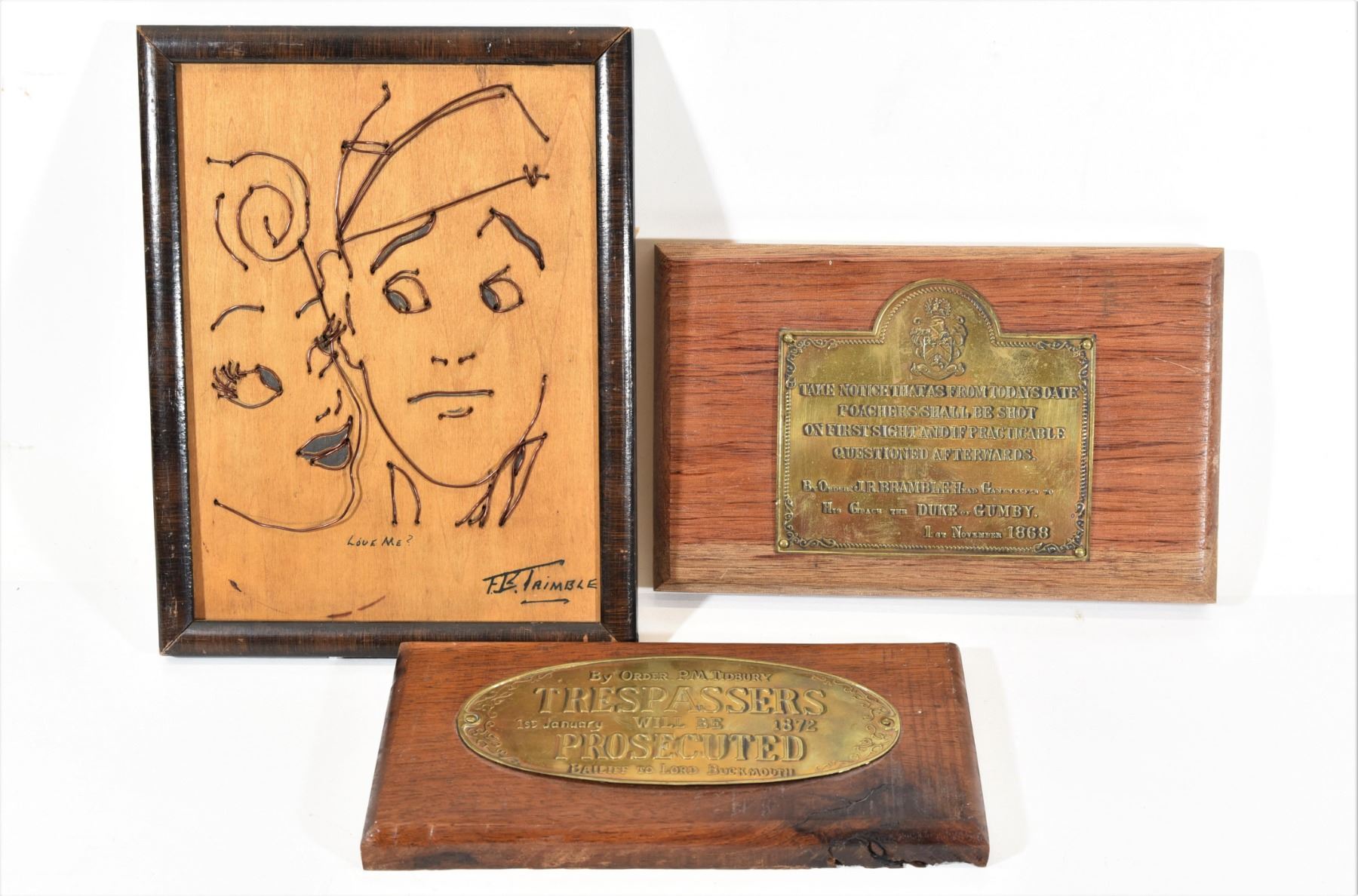 Framed wire art by F.B. Trimble. "Trasspassers Will Be Prosecuted" plaque from January 1872. "Poachers Will Be Shot on First Sight" plaque from November 1868.