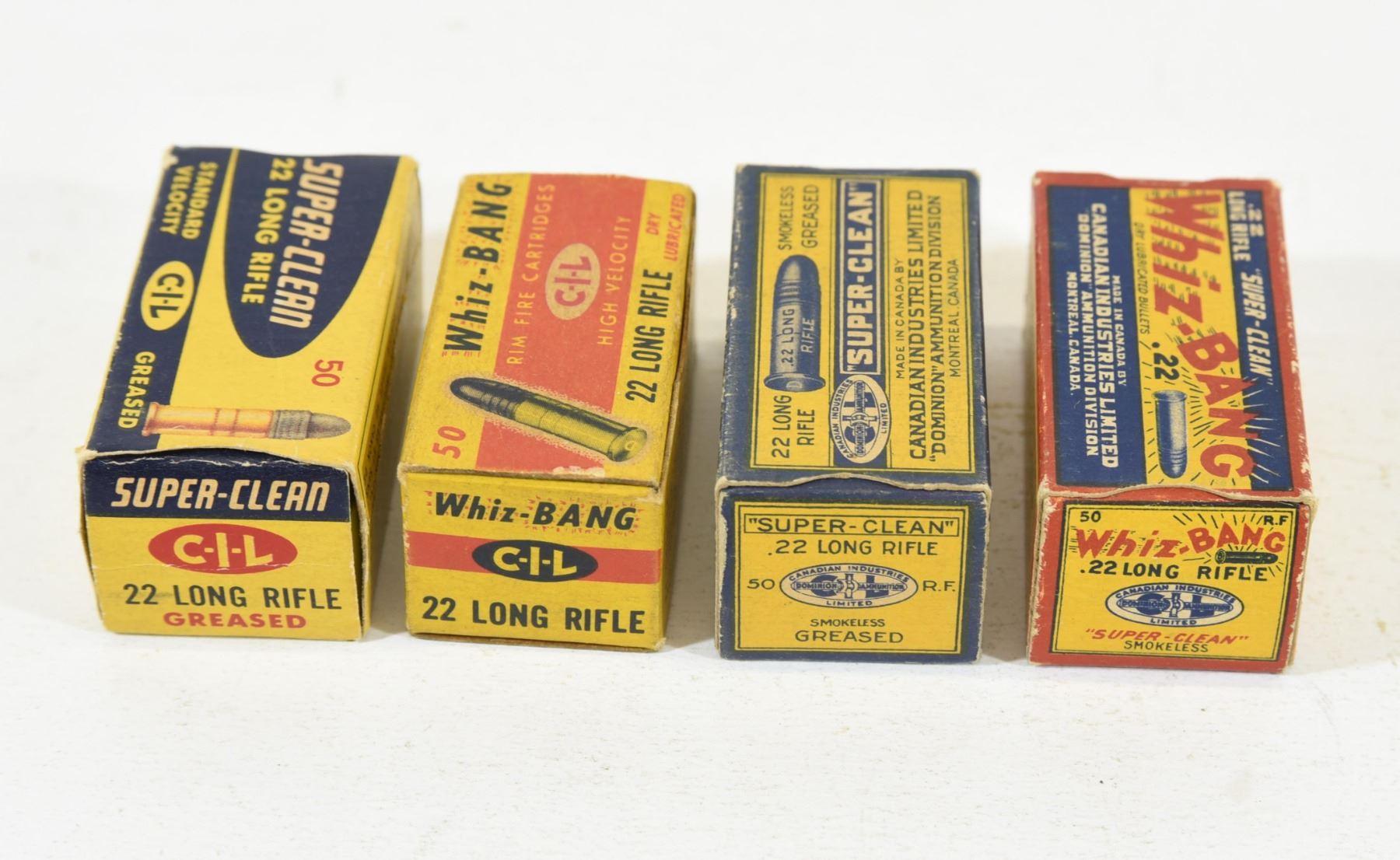 Two 50 round boxes of CIL Whiz-Bang 22LR ammunition. Two 50 round boxes of CIL Dominion Super-Clean 22LR ammunition.
