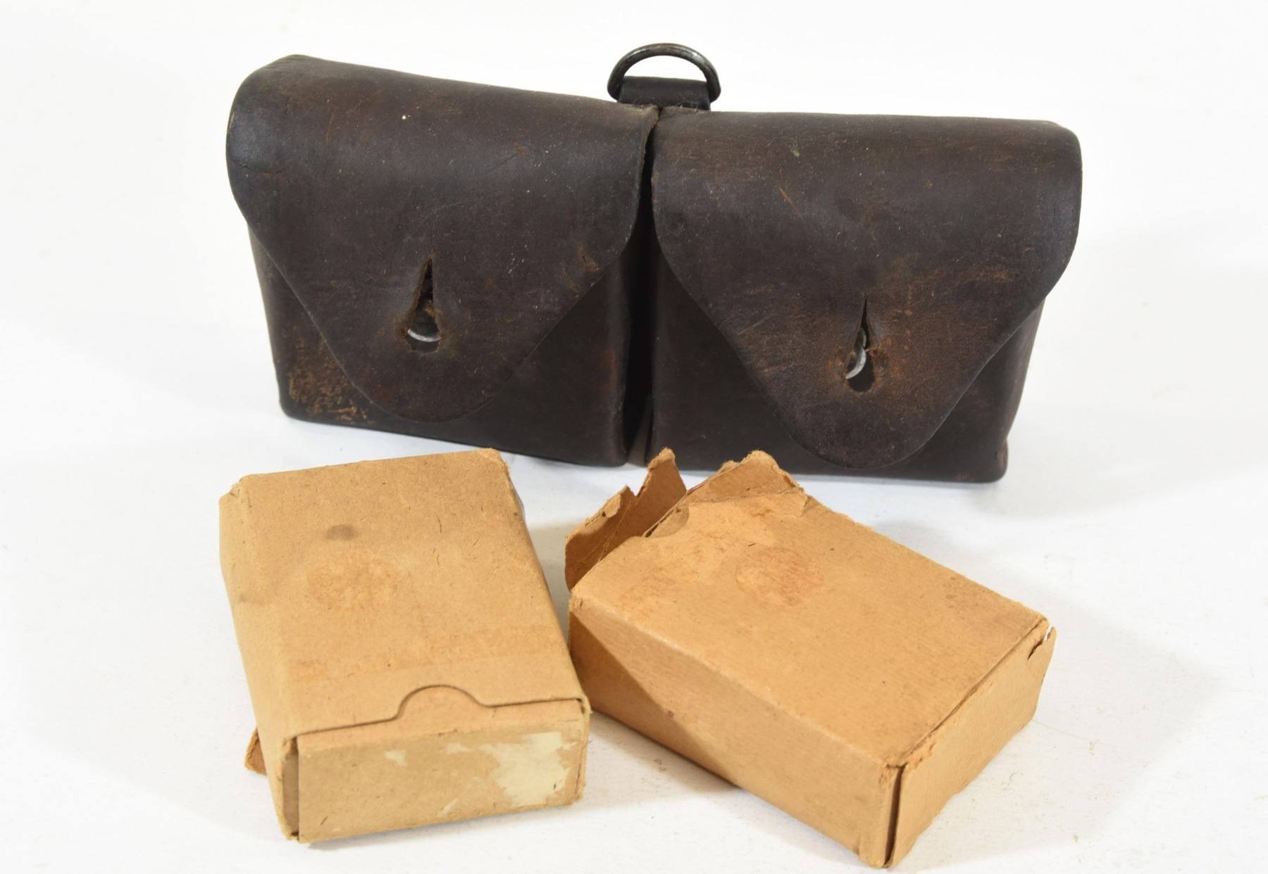 2 vintage packs of 15 rnds each dated 1943 and a leather 2 pouch ammo holder with F. Brechbuhl Sellier Niederscherli stamped on it.