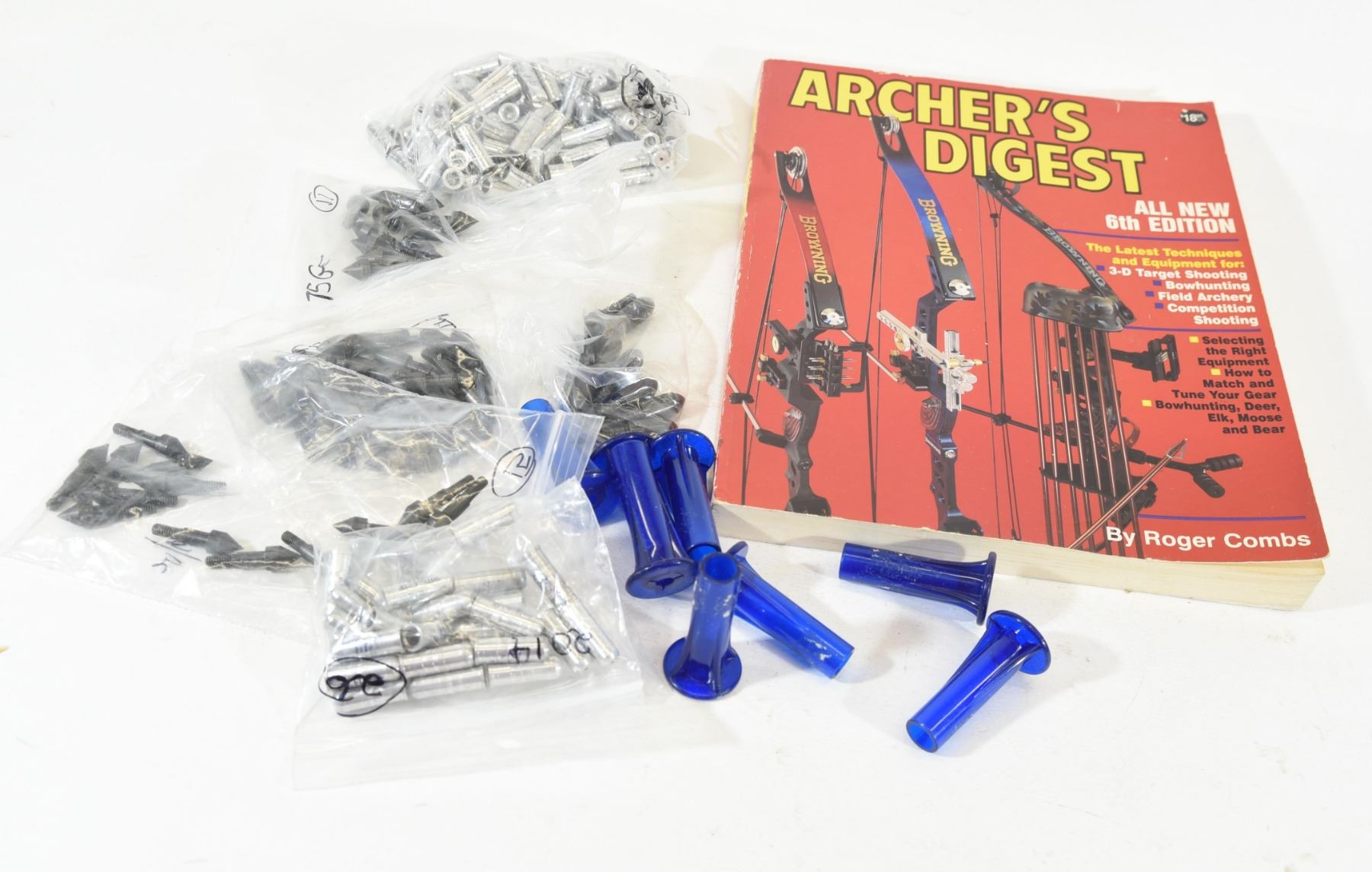1) 140 arrow inserts 2) 60 field tips 3) 8 broadhead wrenches 4) Copy of Archer's Digest
