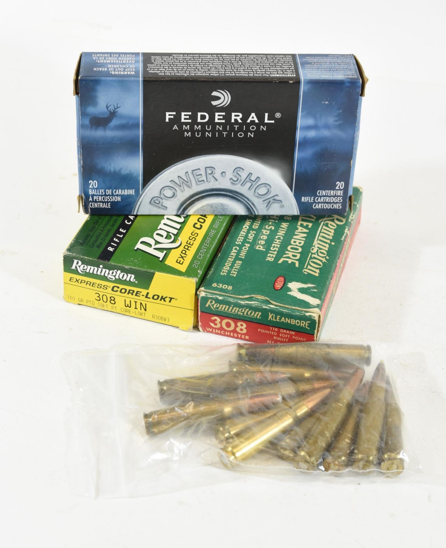 One 18 round box of Remington KleanBore 308 Win Hi-Speed 11-gr Pointed soft point ammunition. One 20 round box of Remington Express Core-Lokt 308 Win 180gr Pointed soft point Core-Lokt ammunition. One 20 round box of Federal 180gr Soft Point ammunition. 13 loose rounds of 308 Win.