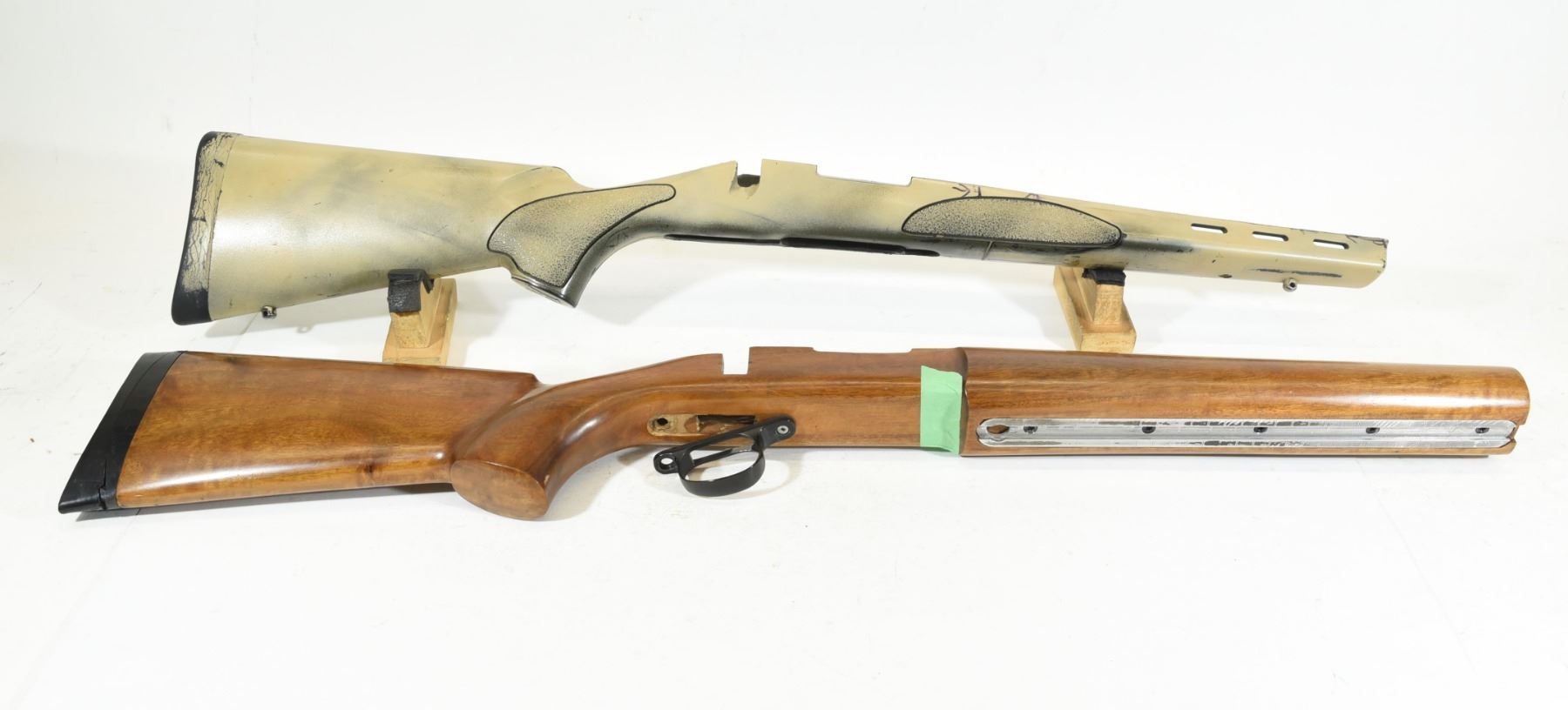1 wooden, 1 synthetic. The wooden is for a mod. 700 target stock and has a few light scratches and dints, a small chip out of the bolt rest and is for a heavy barrel. The synthetic one has been painted and has wear marks and is also for a mod. 700