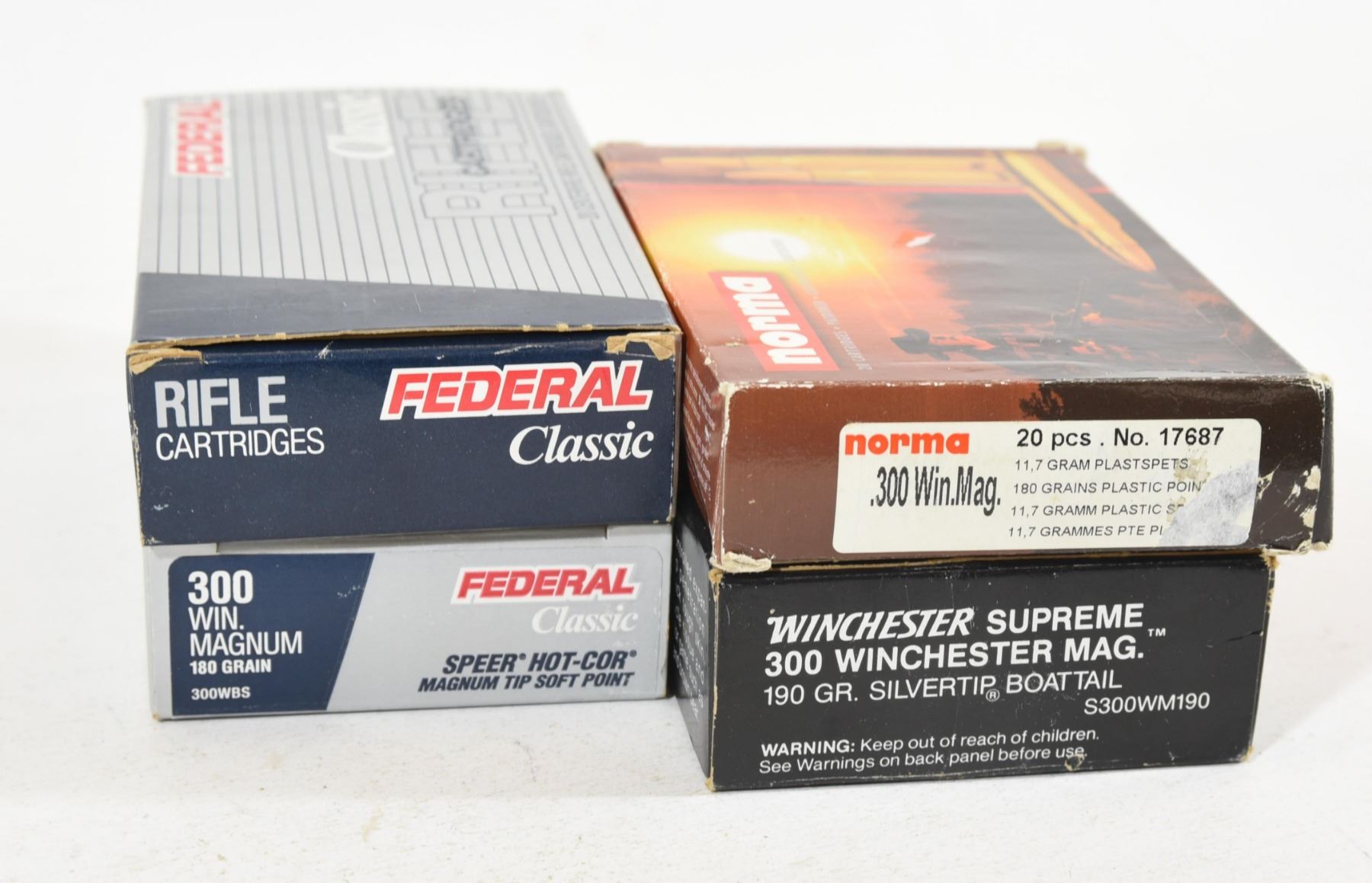 20 round box of Federal Classic 300 Win Mag 180gr Speer Hot-Cor Magnum Tip Soft Point. 20 round box of Federal Classic 300 Win Mag 180gr Sierra Pro-Hunter Soft Point. 20 round box of Wichester Supreme 300 Win Mag 180gr Silvertip Boattail. 20 round box of Norma 300 Win Mag 180gr Plastic Point.