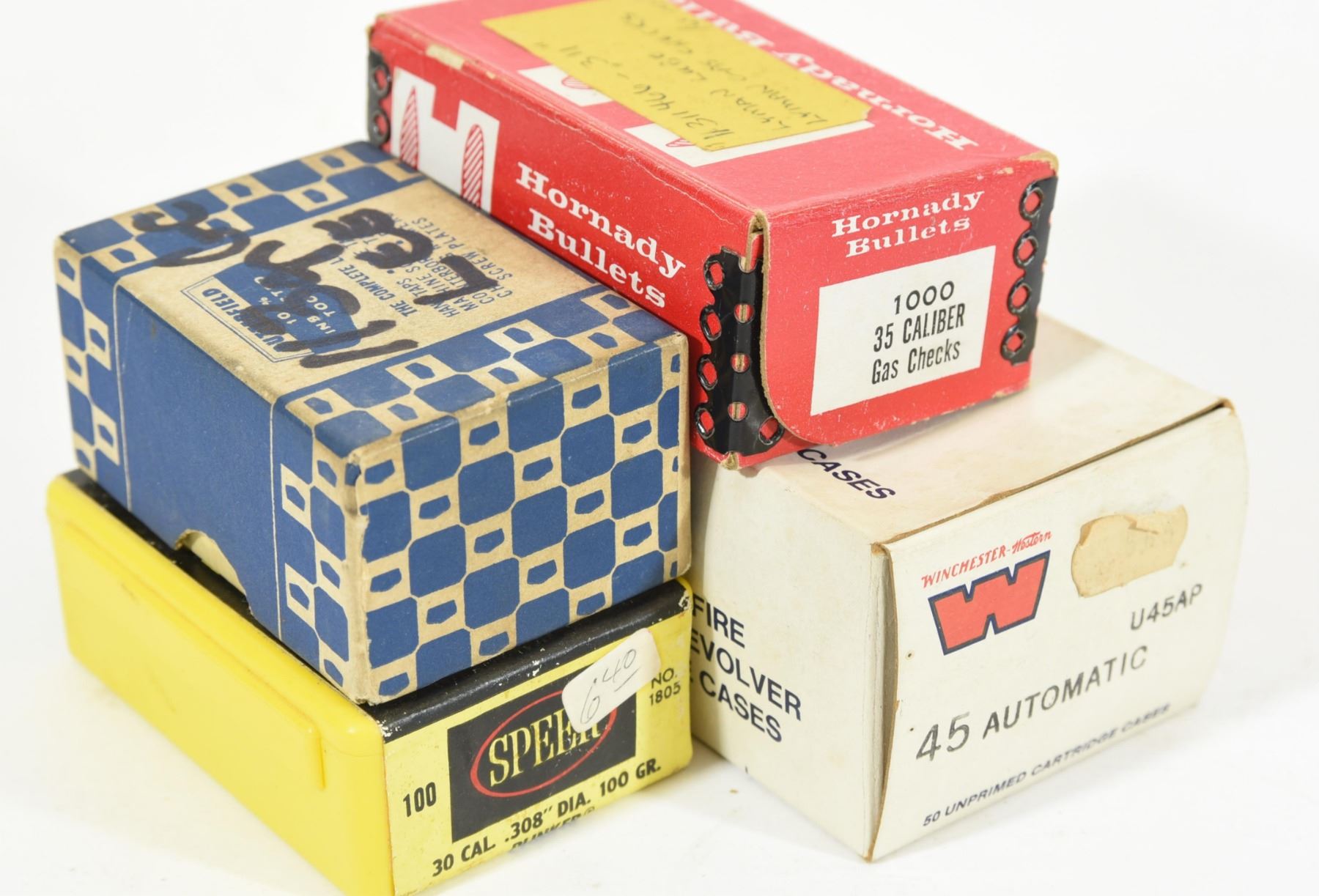 1.25 lb box of .3075" cast bullets. 0.15 lb box of 6 pieces .311" cast bullets cast number Unopened 50 piece box of Speer 30cal .308" 100gr bullets. 2.4 lb box of .4565" cast bullets cast number 457124