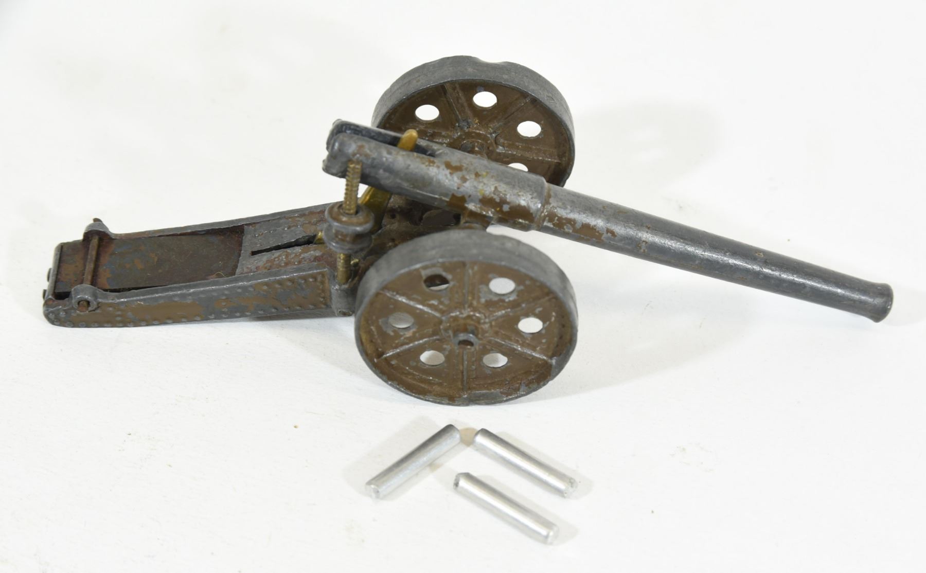 Unknown, Made in England. Small dint in left side wheel, has 3 home made projectiles, works, 8" total length.