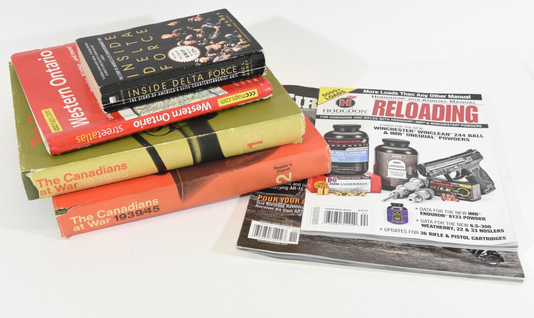 Inside Delta Force by Eric L. Haney. Western Ontario Street Atlas. The Canadians at War 1939/45 Volume One. The Canadians at War 1939/45 Volume Two. Hodgdon Annual Manual from 2018. Firearms News Magaznie from June 2019.