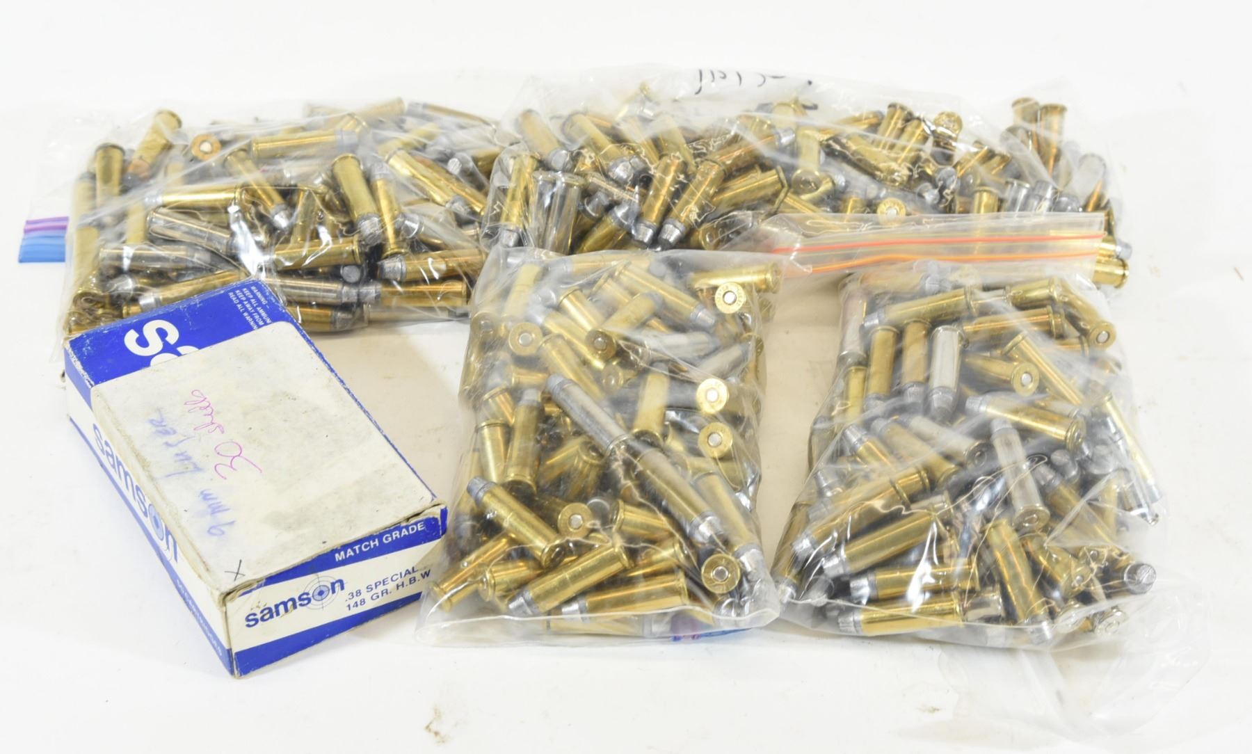 30 round box of Samson 38SPL 148gr H.B.W. ammunition. Four 100 round bags 38SPL ammunition.
