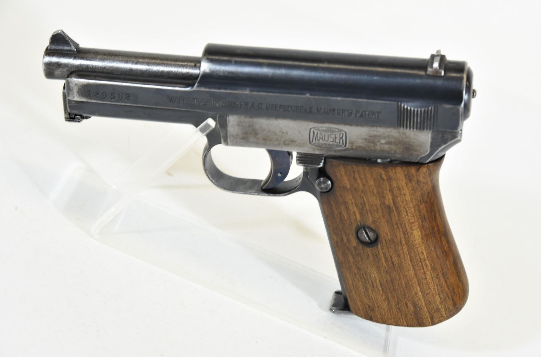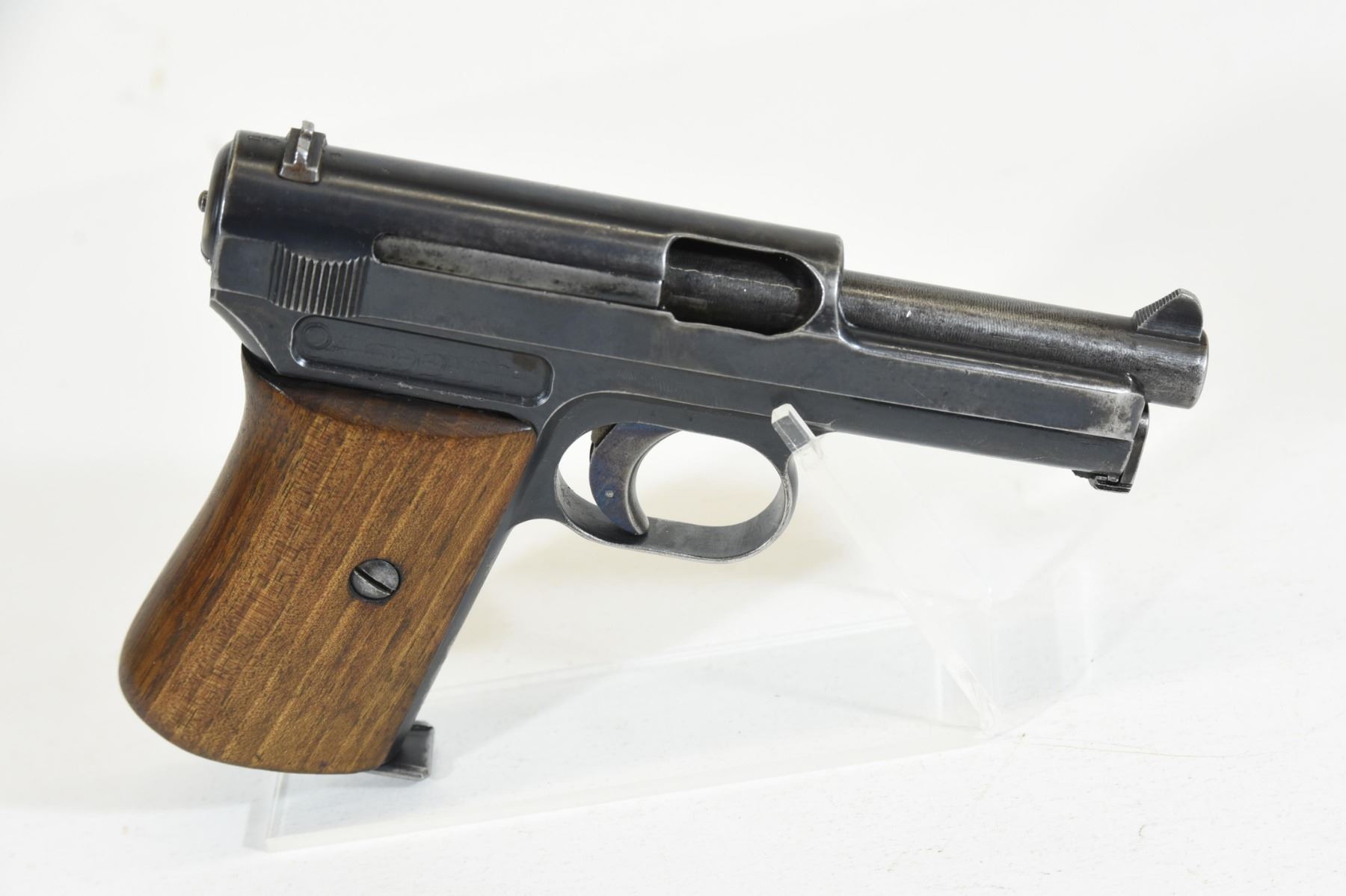 Prohibited, semi-auto, 7.65mm, 89mm barrel, SN 129562. Wood grips have a couple marks, bluing is grey to bare, bore stained.