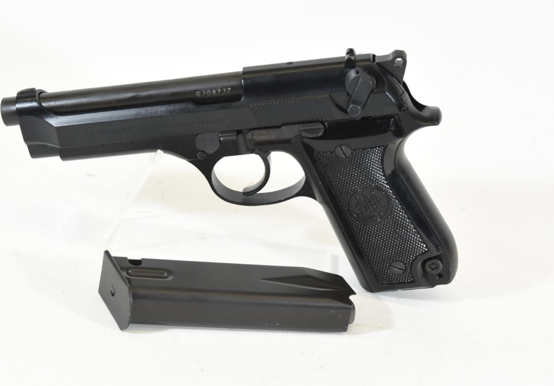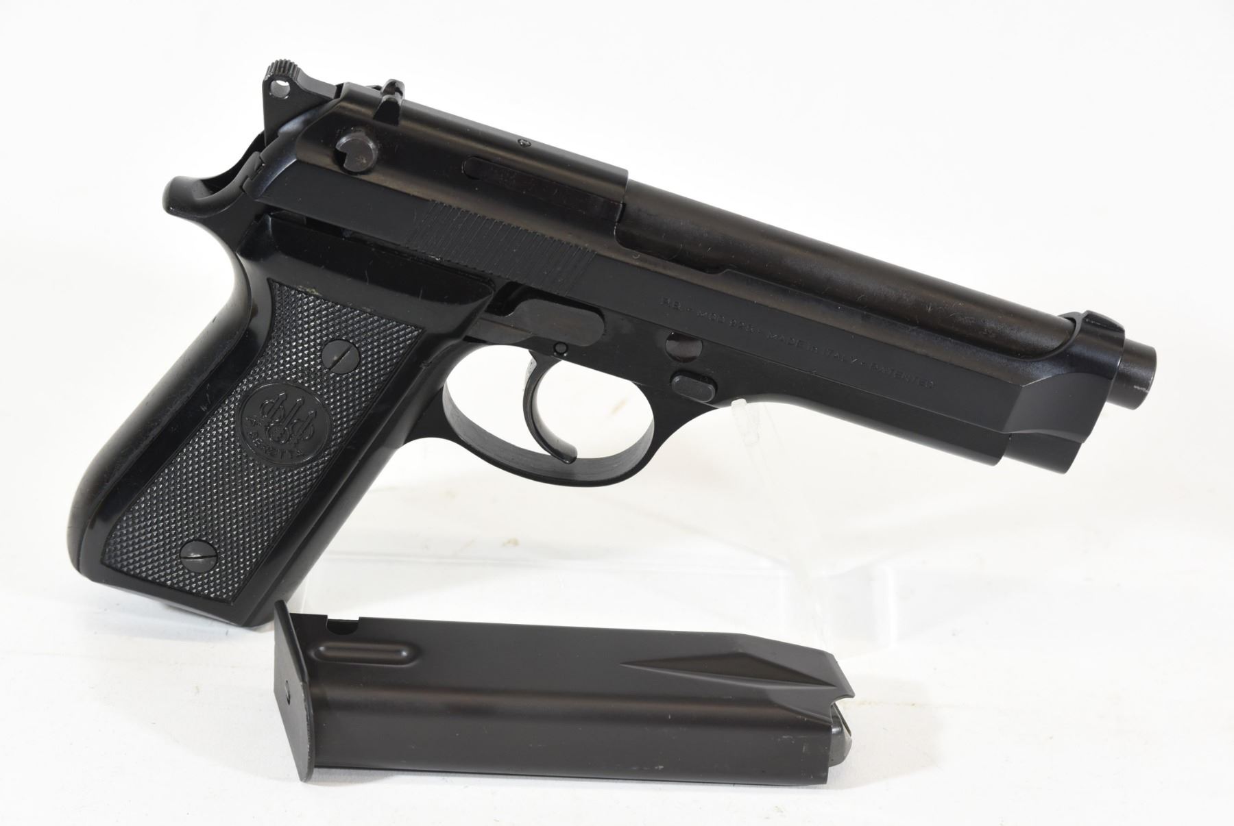 Restricted, semi-auto, 9mm Luger, 125mm barrel. SN U01357Z. Grips have some marks, bluing very good, bore excellent.