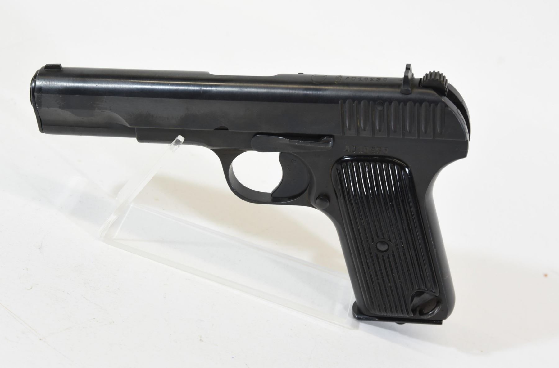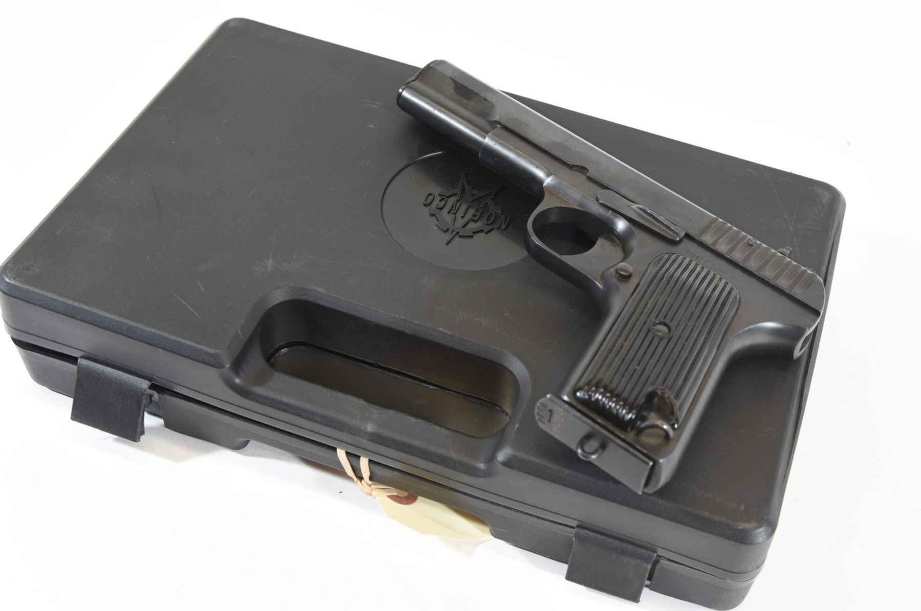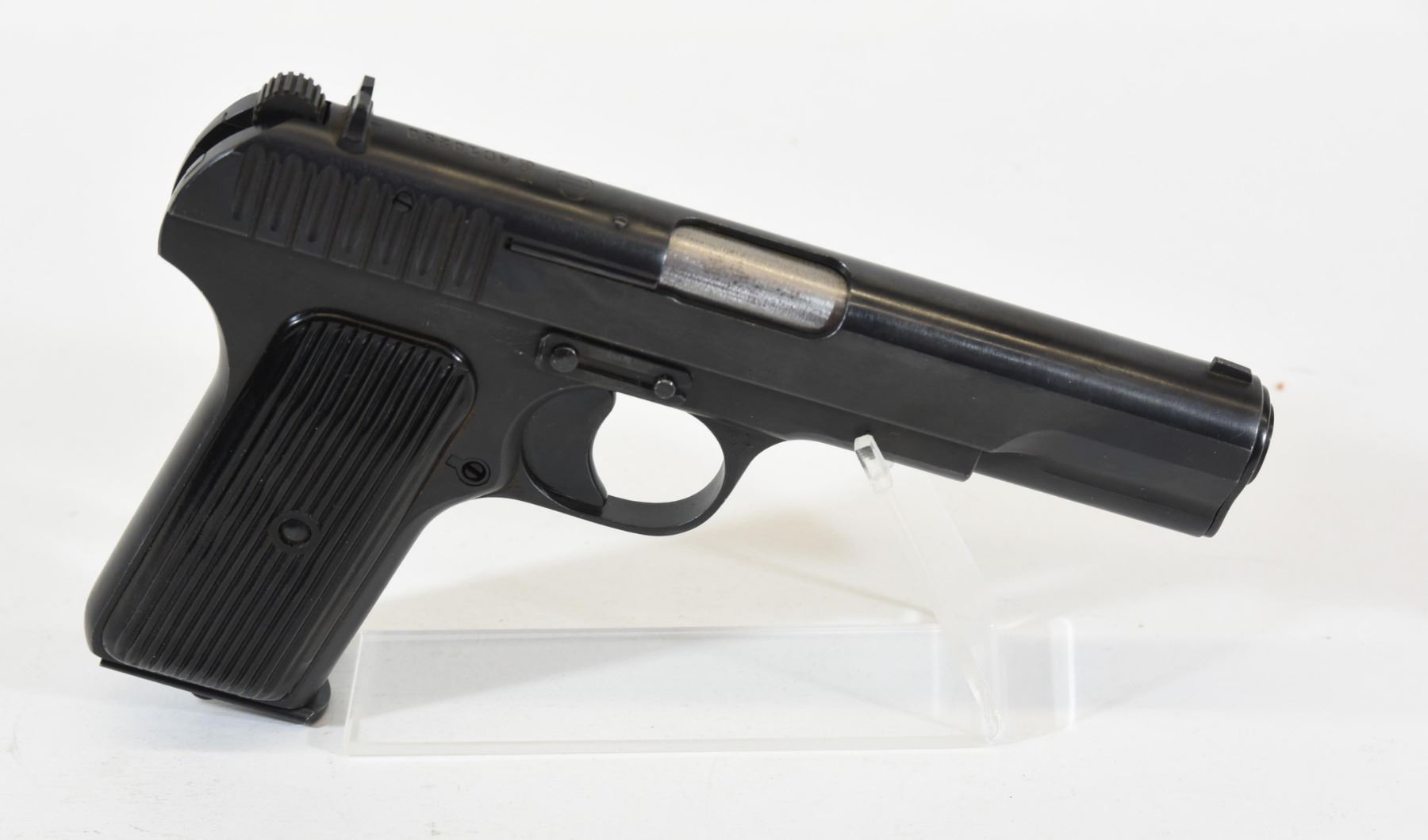 Restricted, semi-auto, 7.62 x 25, 115mm barrel. SN AD10230. Grips very good, bluing is faded, bore stained from corrosive ammo. Comes with carry case.