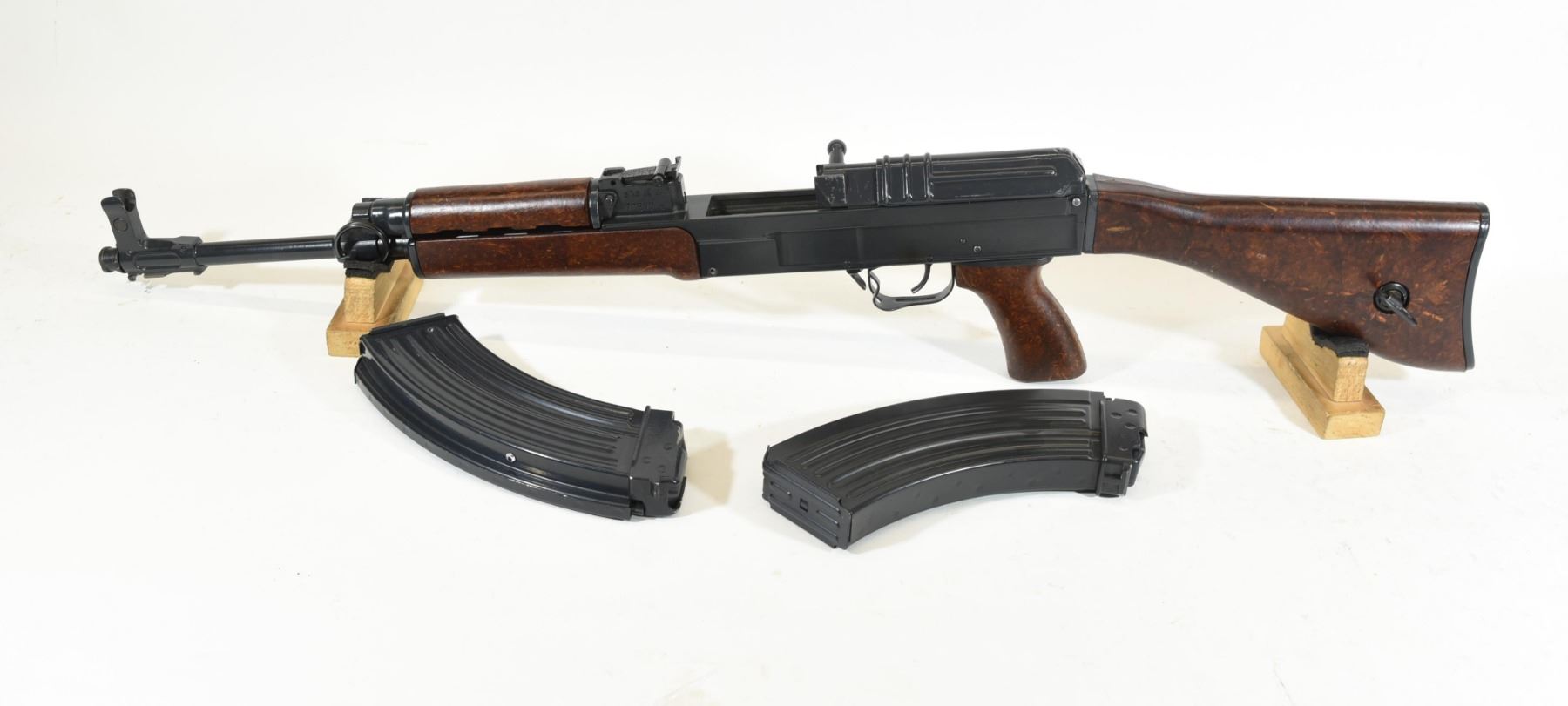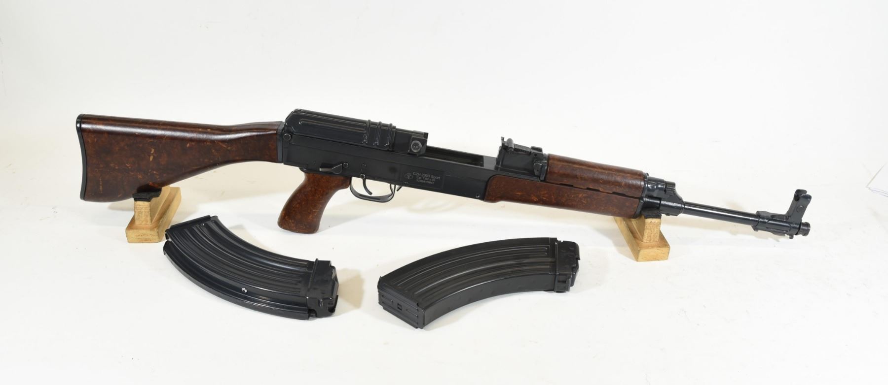 Restricted, semi-auto, 7.62 x 39, 390mm barrel. SN 0242470847. Wood and metal finish have some scratches, bore excellent. Two mags pinned to 5.