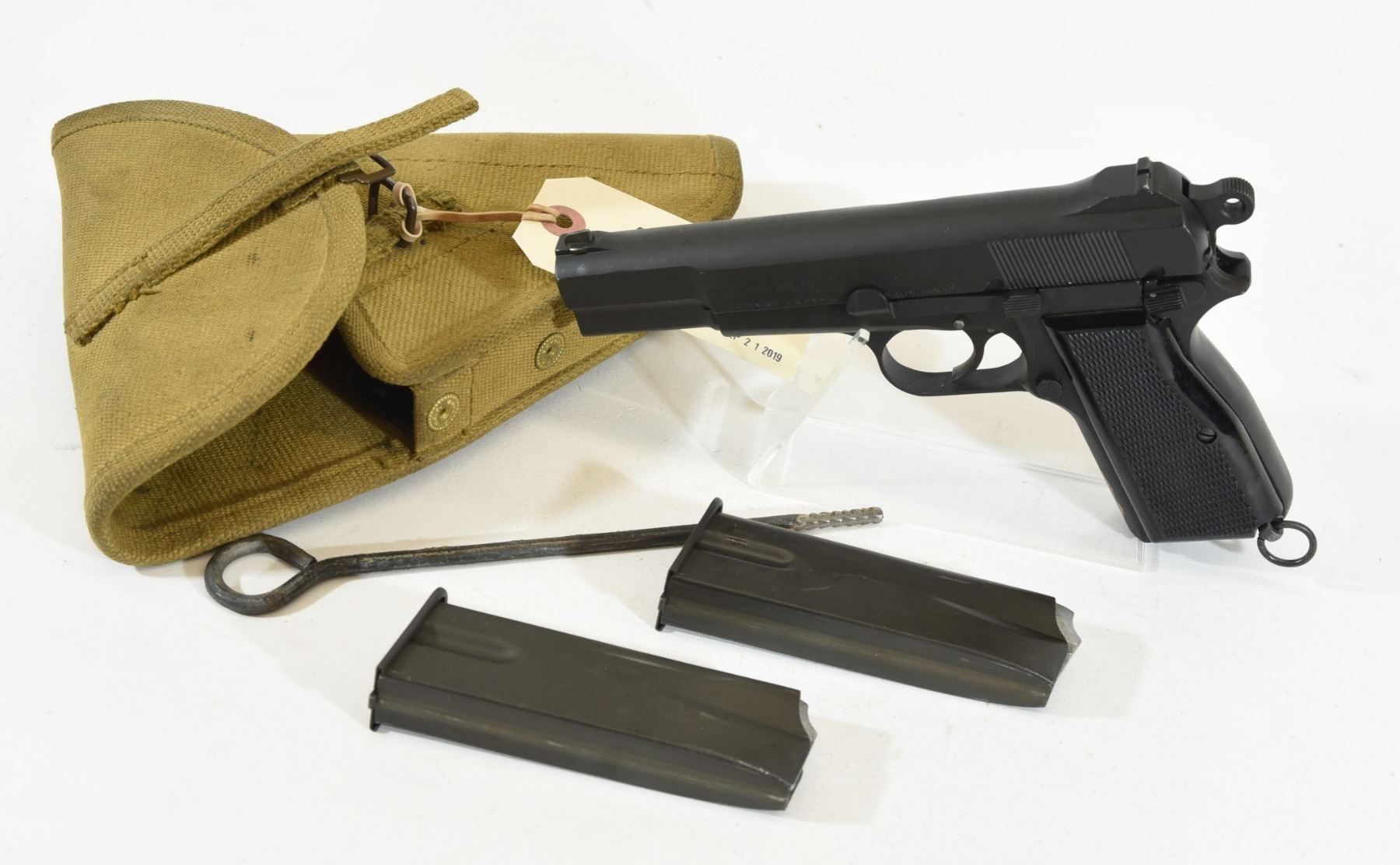 Restricted, semi-auto, 9mm Luger, 118mm barrel. SN 3T4860. Made by Inglis Canada. Excellent condition, comes with canvas holster dated 1944, cleaning rod, extra mag.