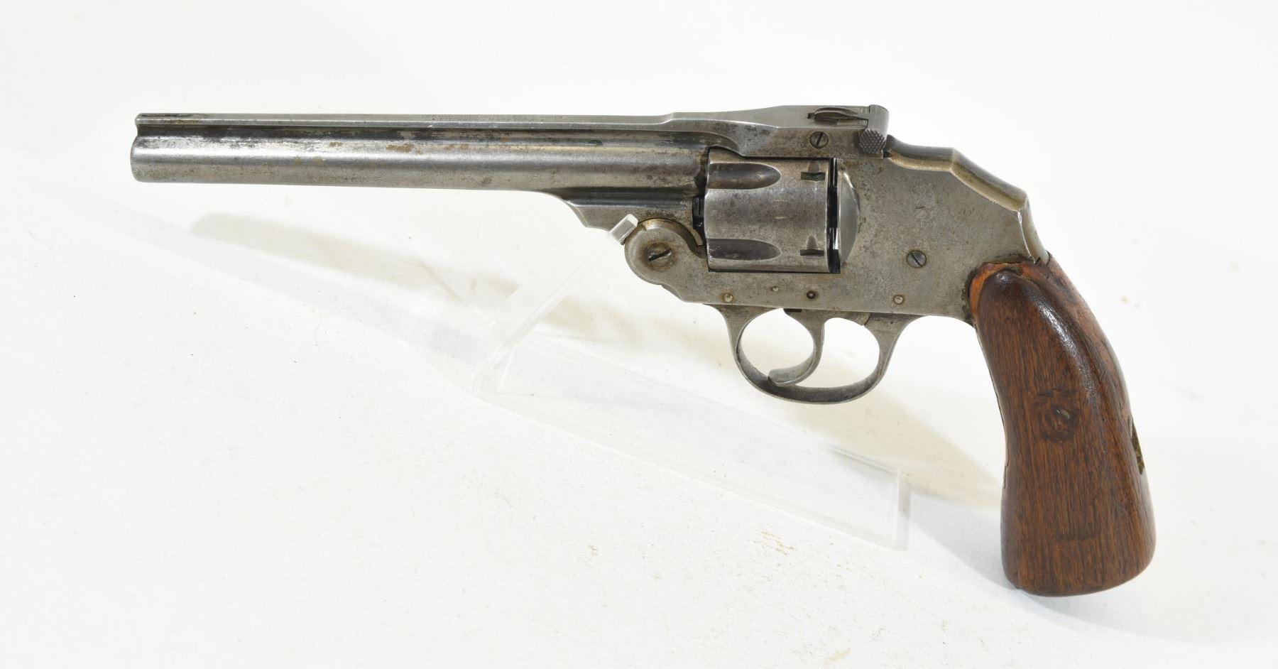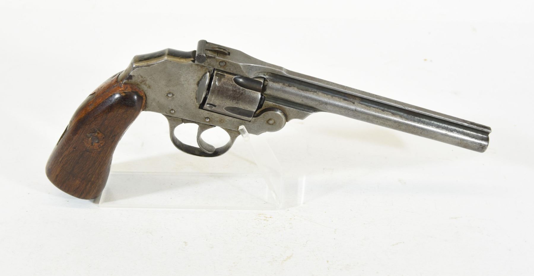 Restricted, revolver, 38 S&W, 152mm barrel. SN 59806. Wood grips not original, bluing grey with brown patches, bore pitted.