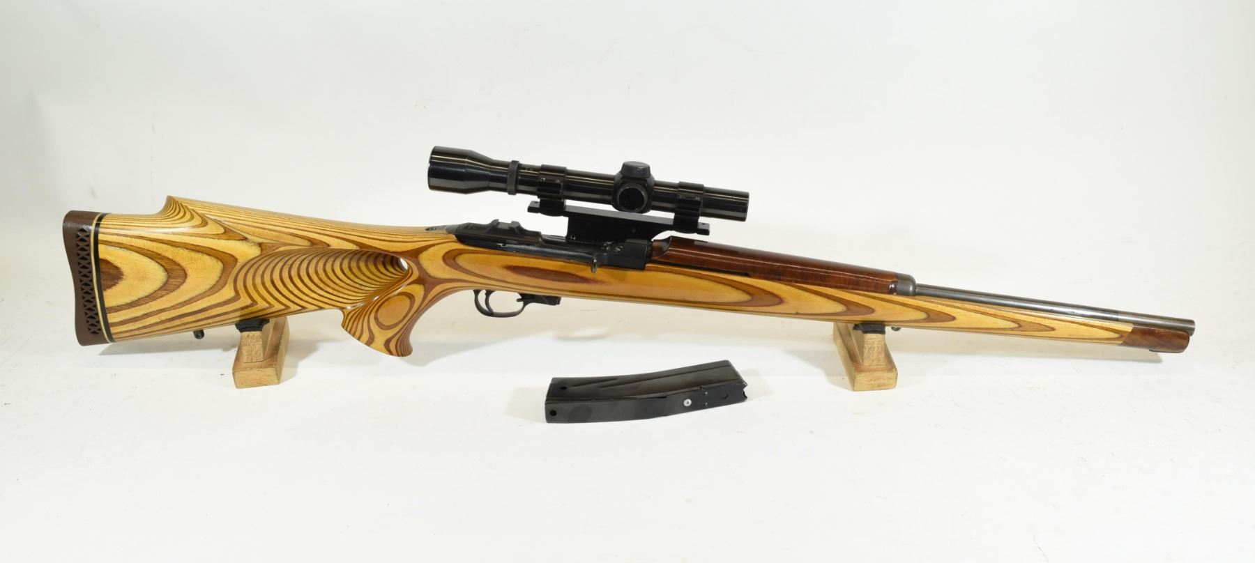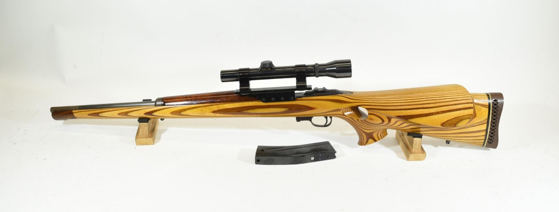 Restricted, semi-auto, 30 Carbine, 457mm barrel. SN 4229914. Sporter thumb hole stock very good, bluing turning grey, bore excellent. Comes with Weaver K2.5-1 scope. Mag pinned to 5.