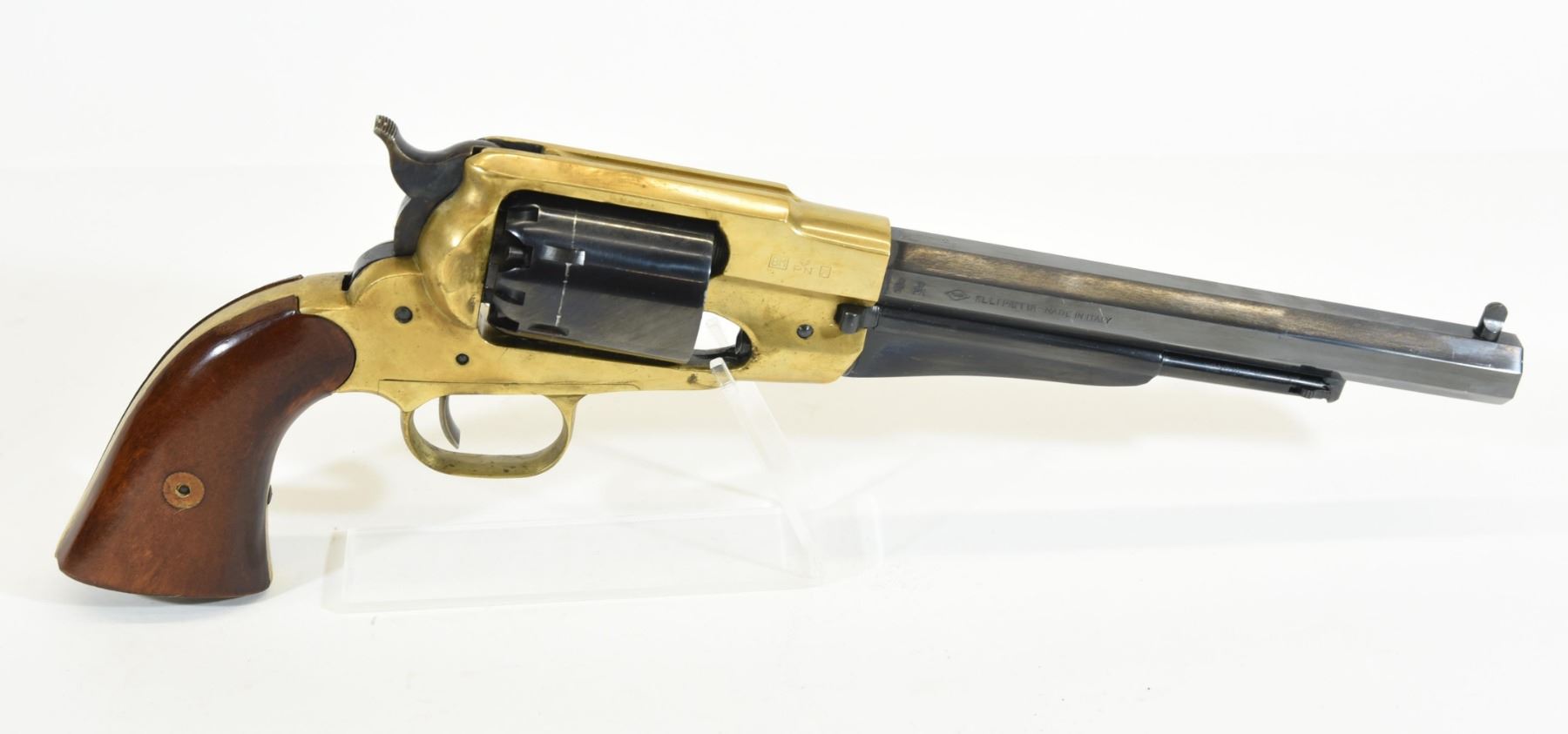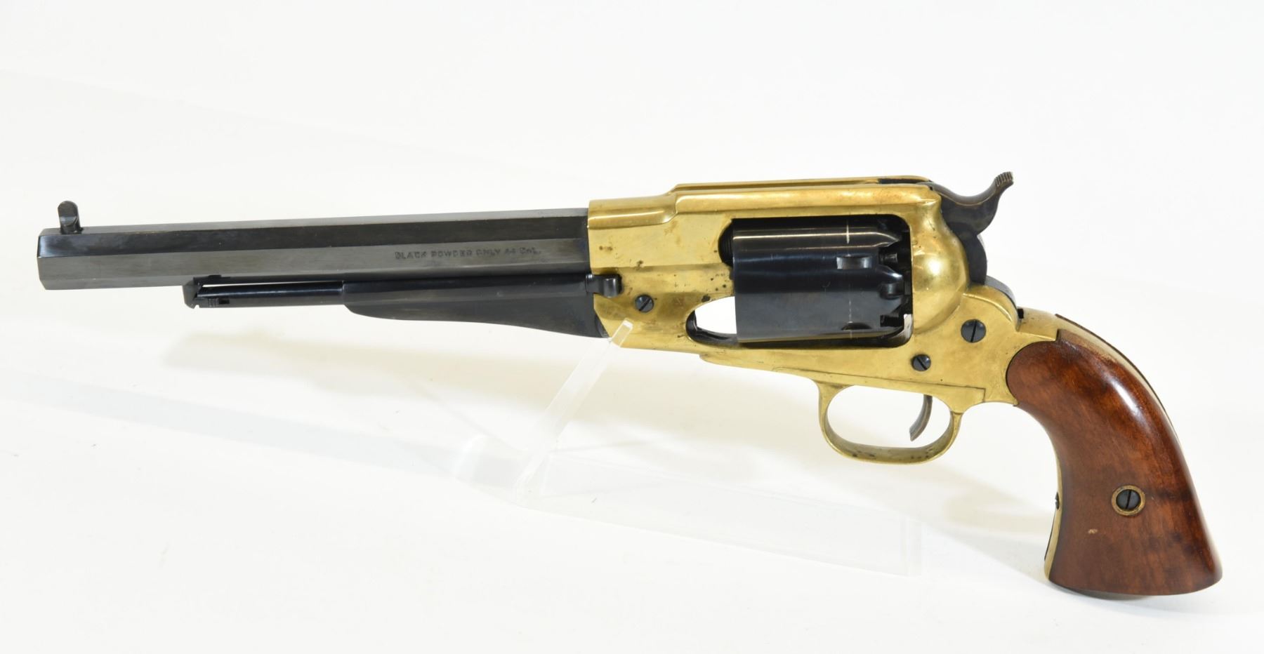 Restricted, revolver, 44 Percussion, 205mm barrel. SN R264020. Wood grips have a mark, bluing has a couple scratches, brass frame has pit marks ahead of cylinder, bore good.
