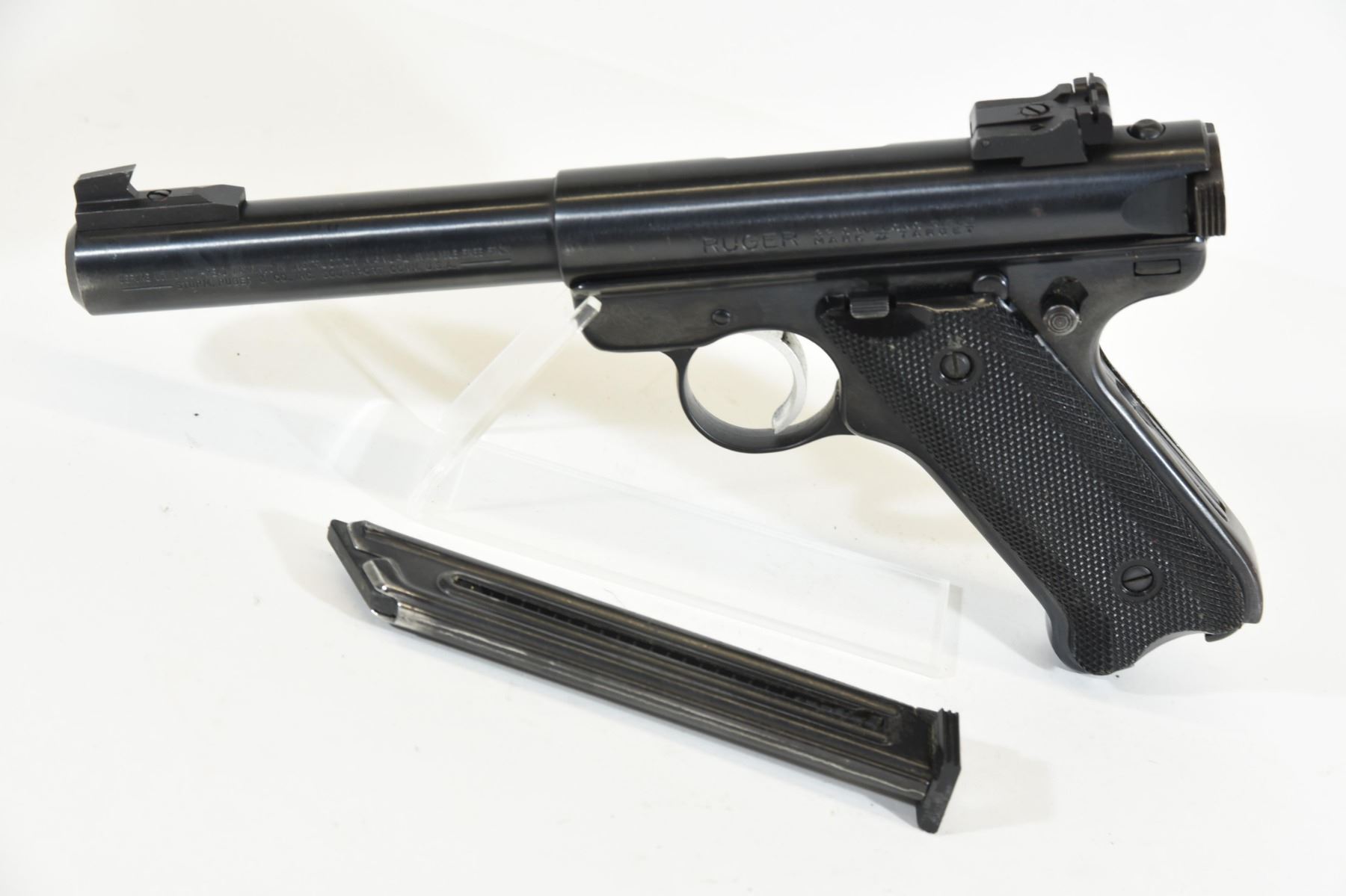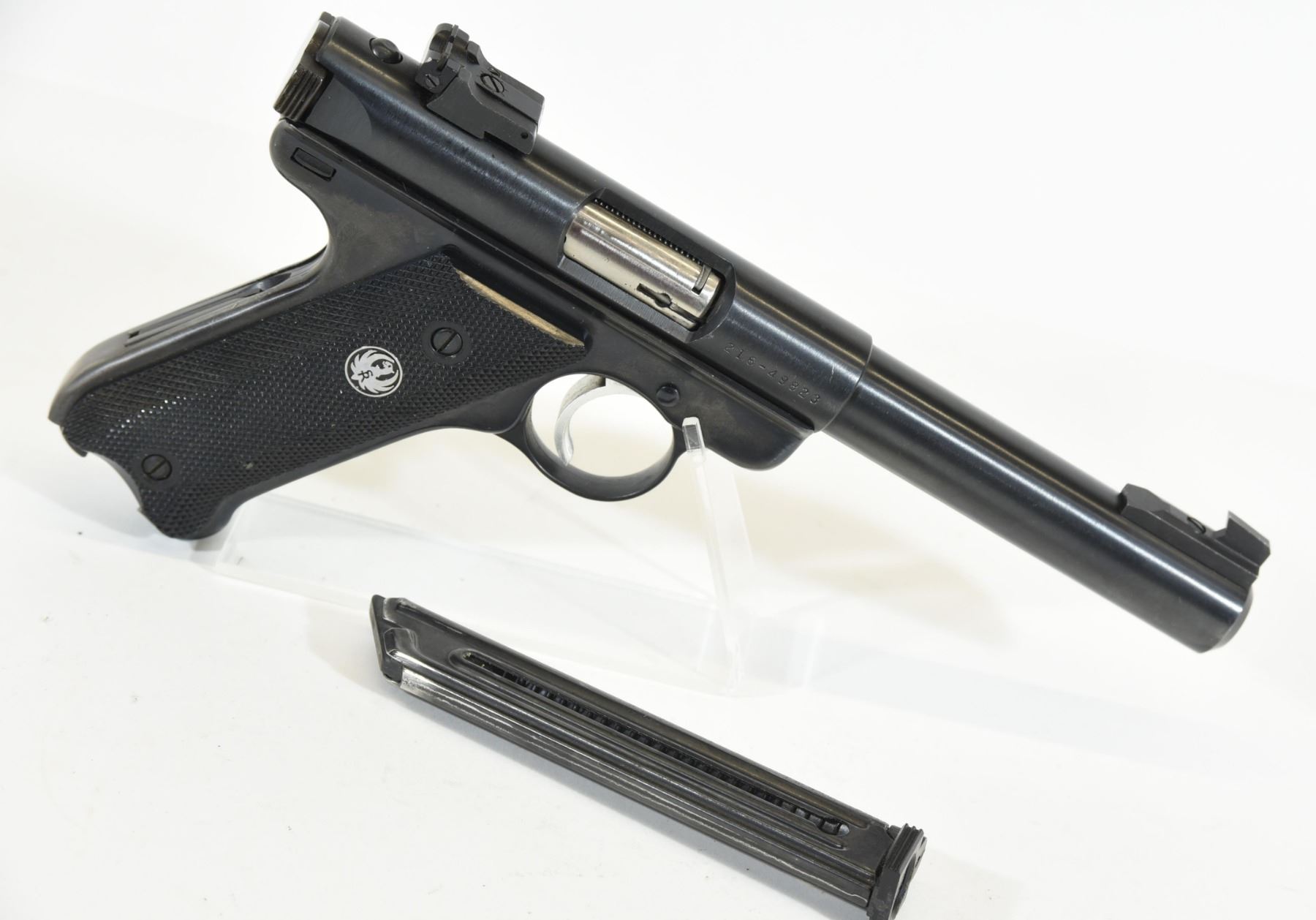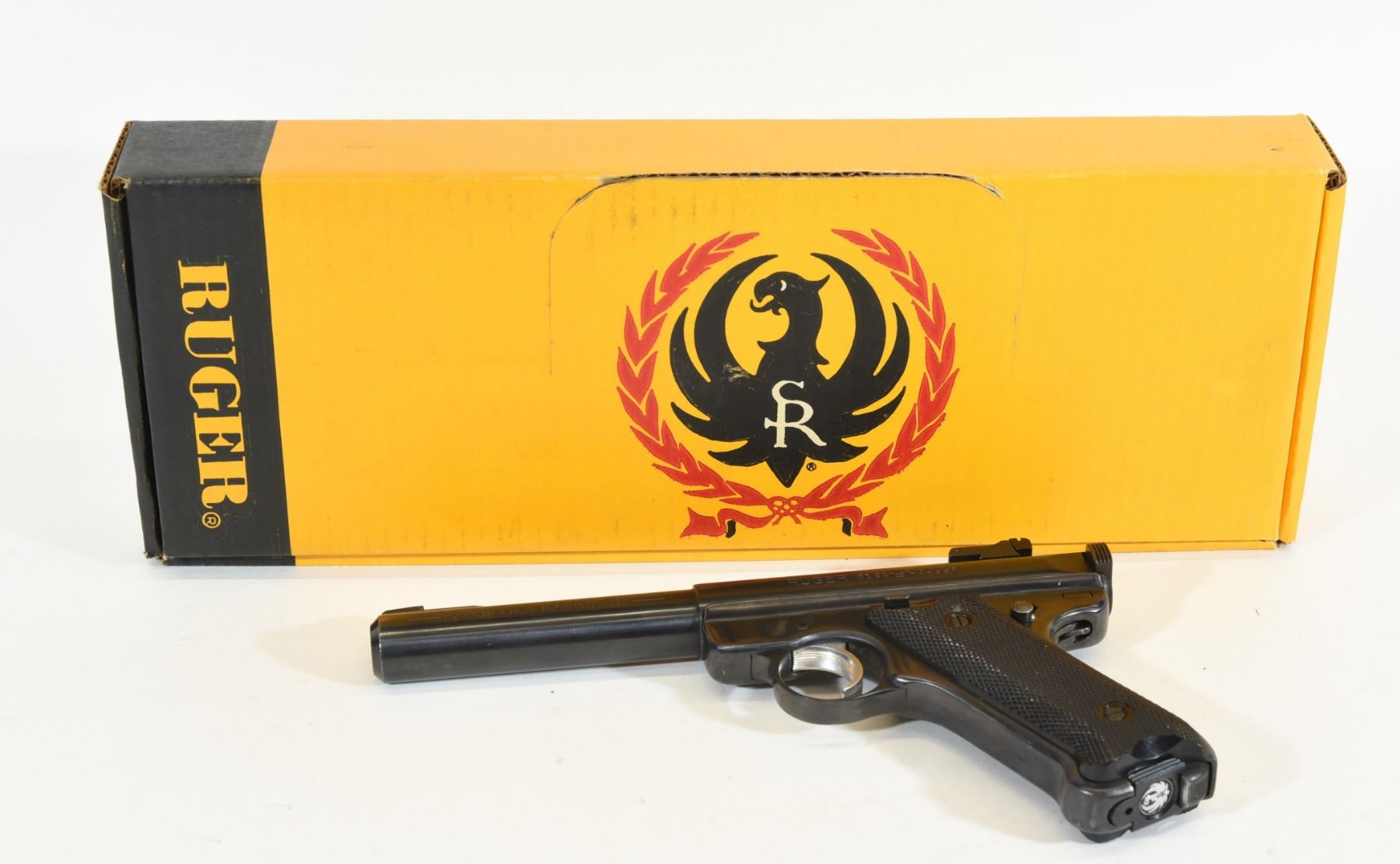 Restricted, semi-auto, 22LR, 135mm bull barrel. SN 21649823. Grips very good, bluing has a pit mark, bore excellent. Original box.