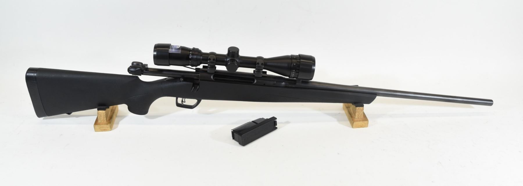 Non-restricted, bolt action, 30-06 sprg, 22" barrel. SN RM15784F. Synthetic stock in very good condition, bluing is marked and has some surface rust on barrel from the muzzle for about 5", bore is excellent, comes with one mag and a Bushnell dusk to dawn 4 - 12 x 40 scope.