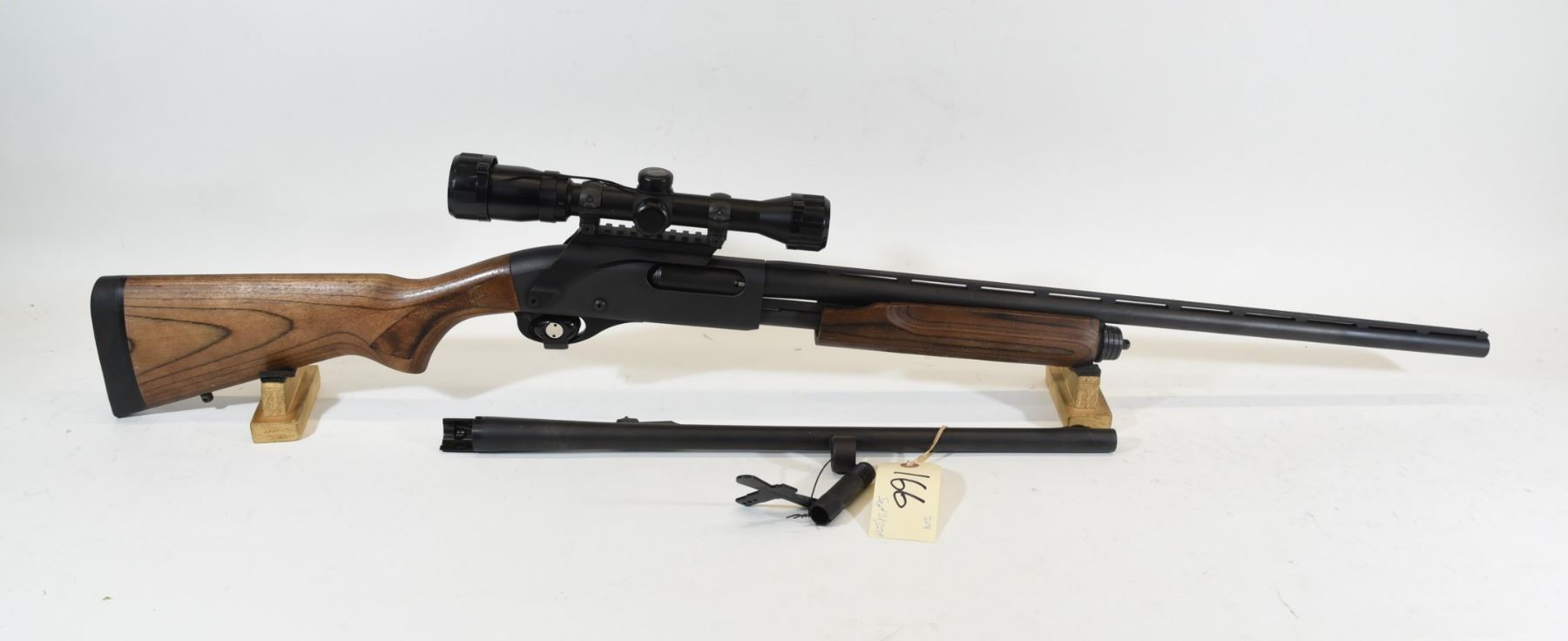 Non-Restricted, Remington 870 20ga Pump Shotgun 2 3/4 or 3" chamber. Wood stock has some small scratches and dents. Bluing is fair. Bore is fair. S/N N/A. Has rifled barrel and smooth bore barrel. Has 1.75-4x32 Bushnell Banner scope. Has super full turkey choke and choke wrench.