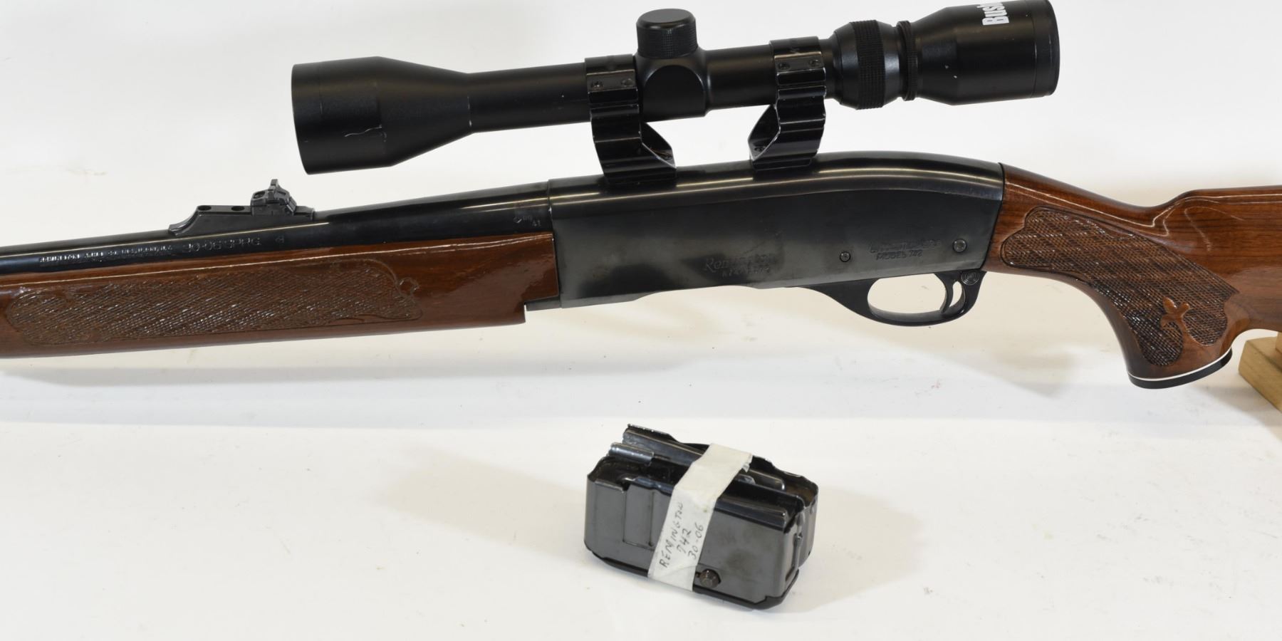 Non-Restricted, Remington Model 742 Semi-Auto Rifle in 30-06SPRG. Wood stock is lightly scratched and dented. Bluing is fair with some small scratches on action. Bore is fair with very prominent rifling. S/N A7448872. Has 2 magazines. Has Bushnell 3-9x40 scope.