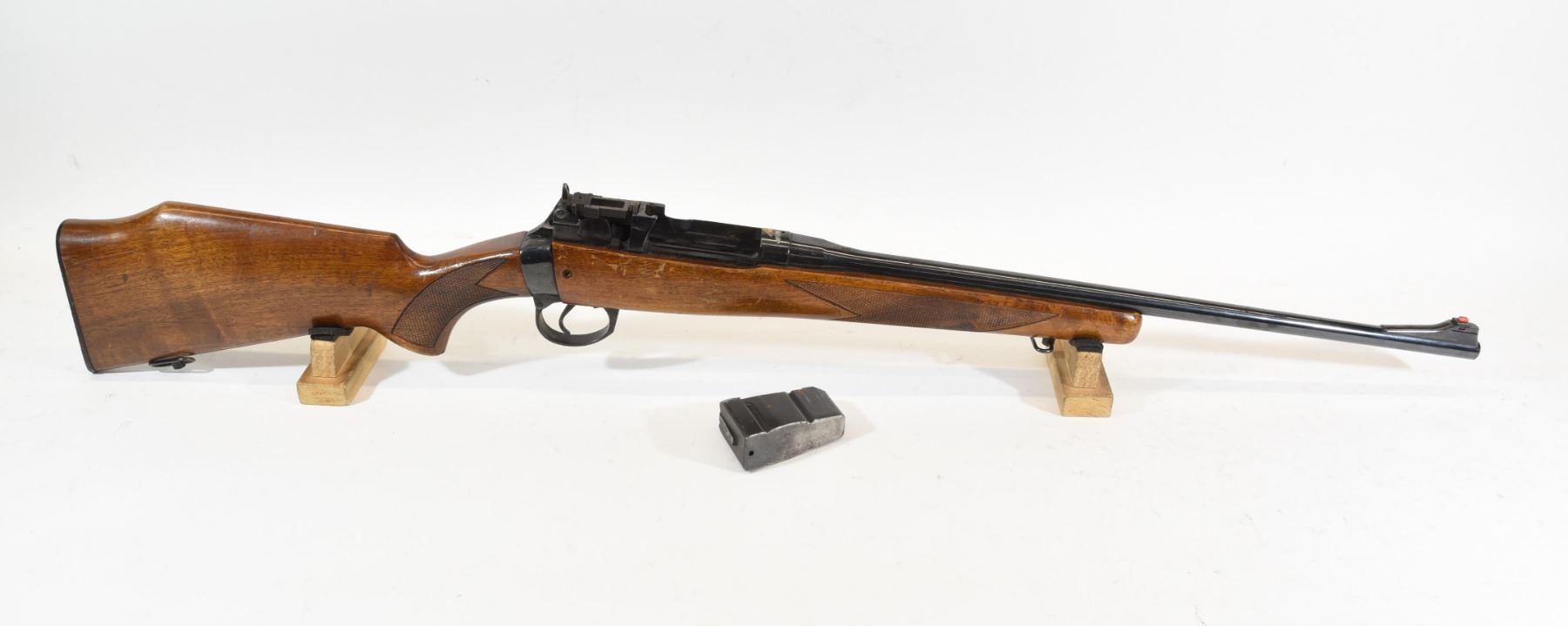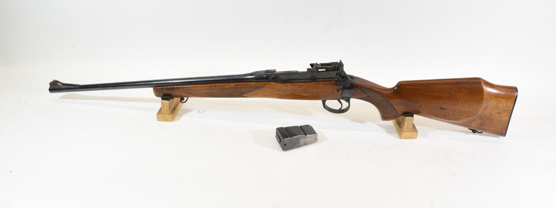 Non-restricted, bolt action, 303 British, 22" barrel. SN 26812. Wood has handling marks and a couple of dints and scratches, bluing is fair with a few spots of rust, bore is good, missing the bolt, has one mag.