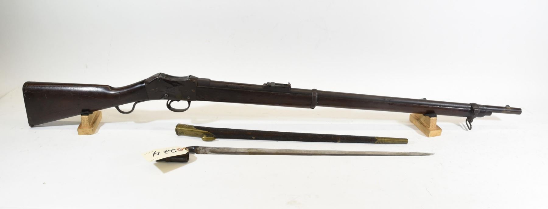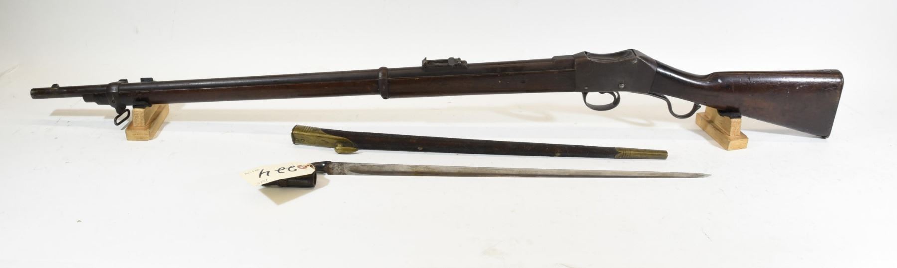 Antique, single shot, 577/ 450 Martini Henry, 33" barrel. No SN. Wood stamped III over 1 and Enfield, numerous dents and marks, bluing is brown, bore very good. Comes with bayonet and sheath.
