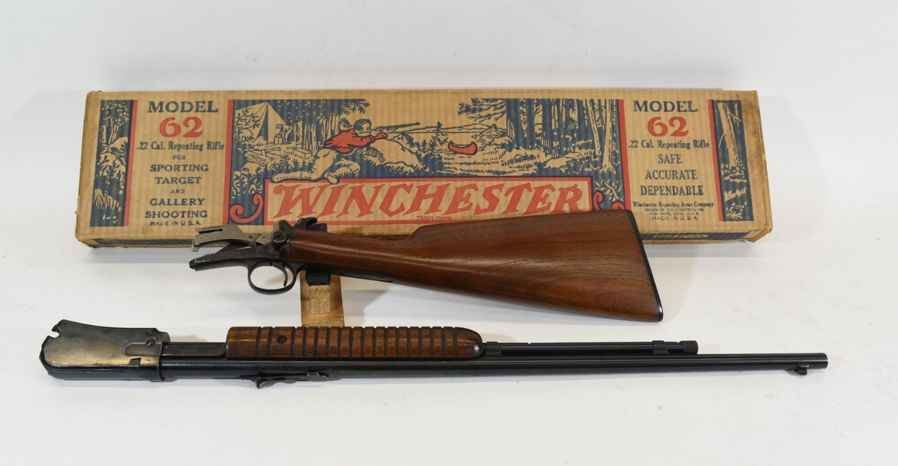 Non-restricted, pump action, 22LR, 23" barrel, SN 211723. Wood excellent, bluing has some marks and pit marks, bore excellent. Original box.