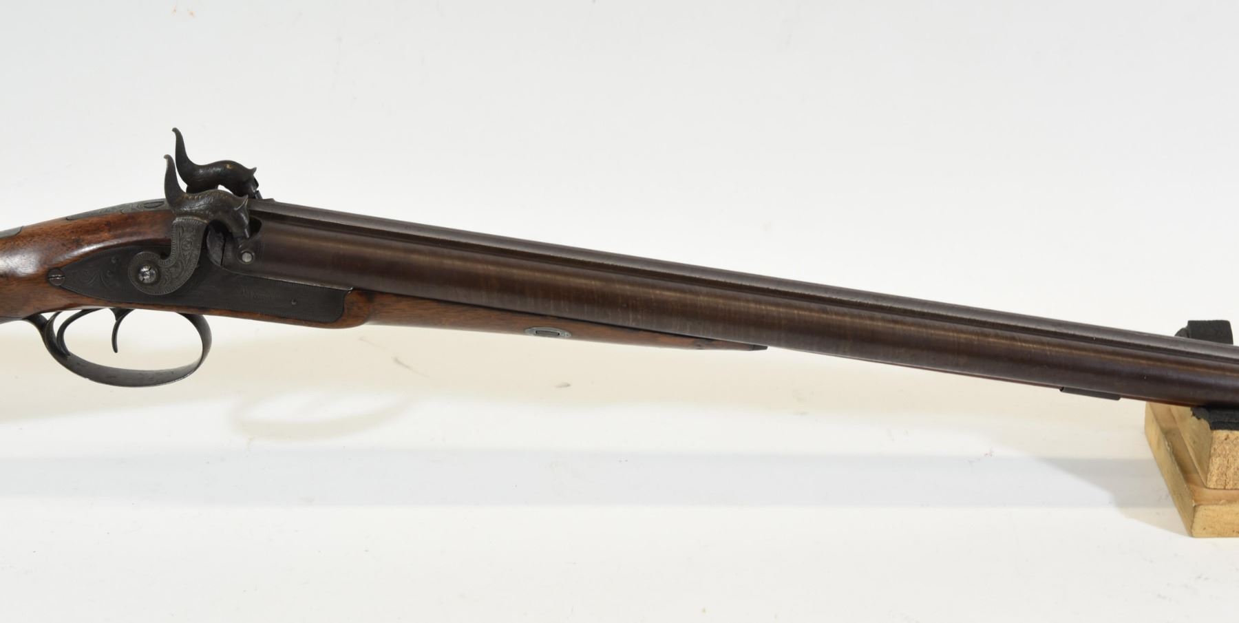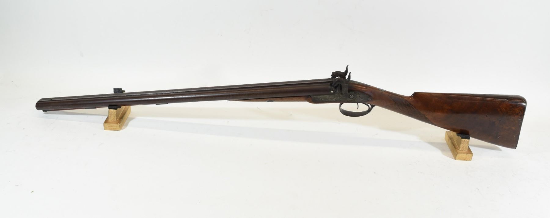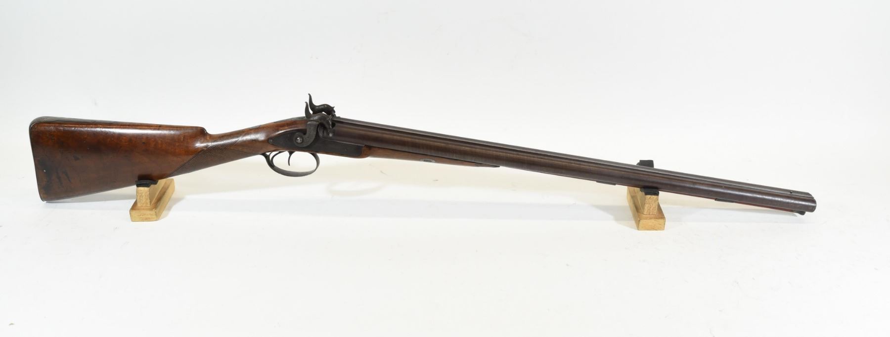 Antique, multi-barrel, 12Ga Percussion, 26" Damascus barrels. No SN. Wood has some dents and scratches, bluing is brown, bores pitted.