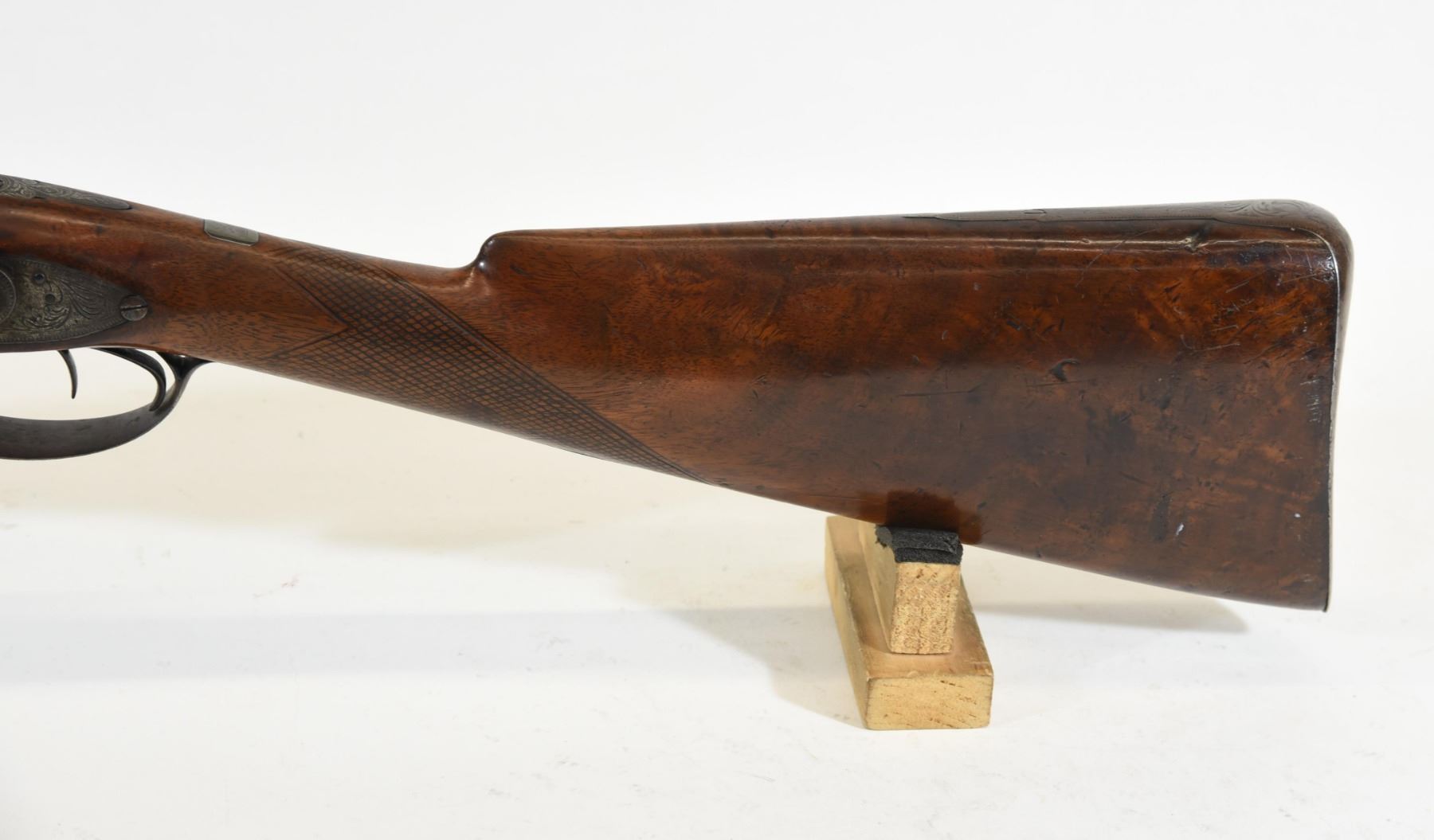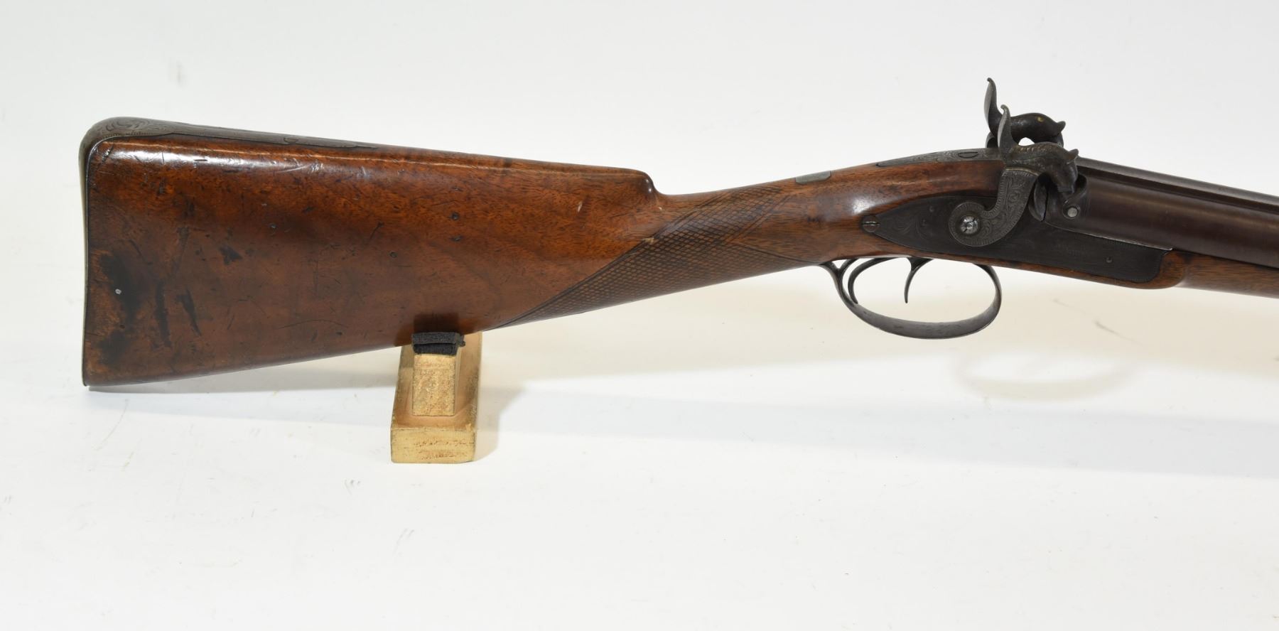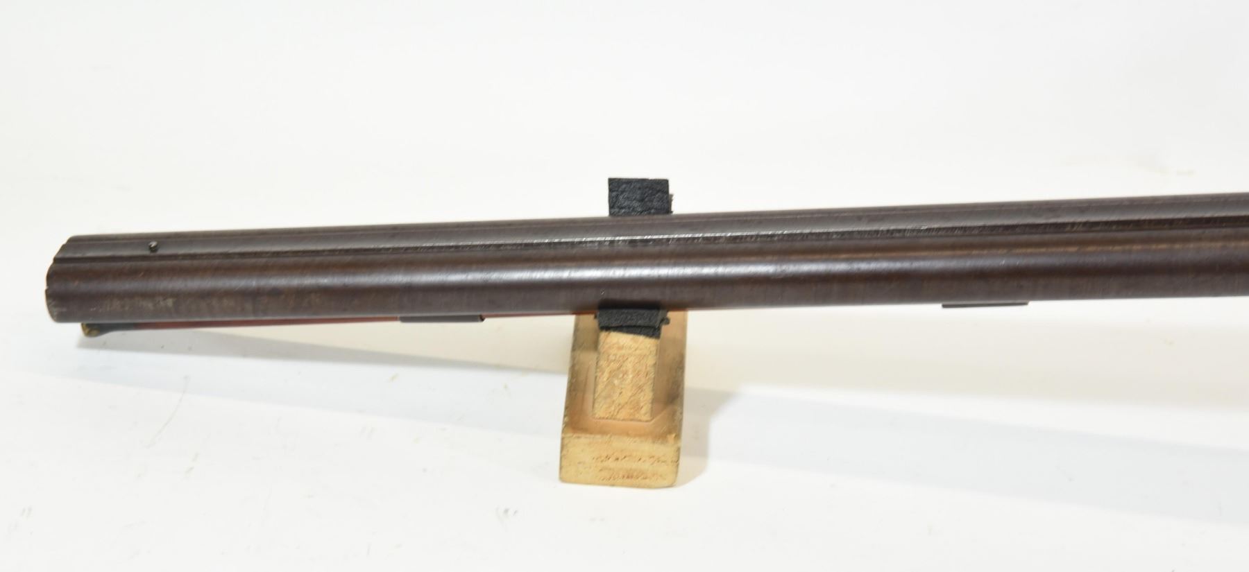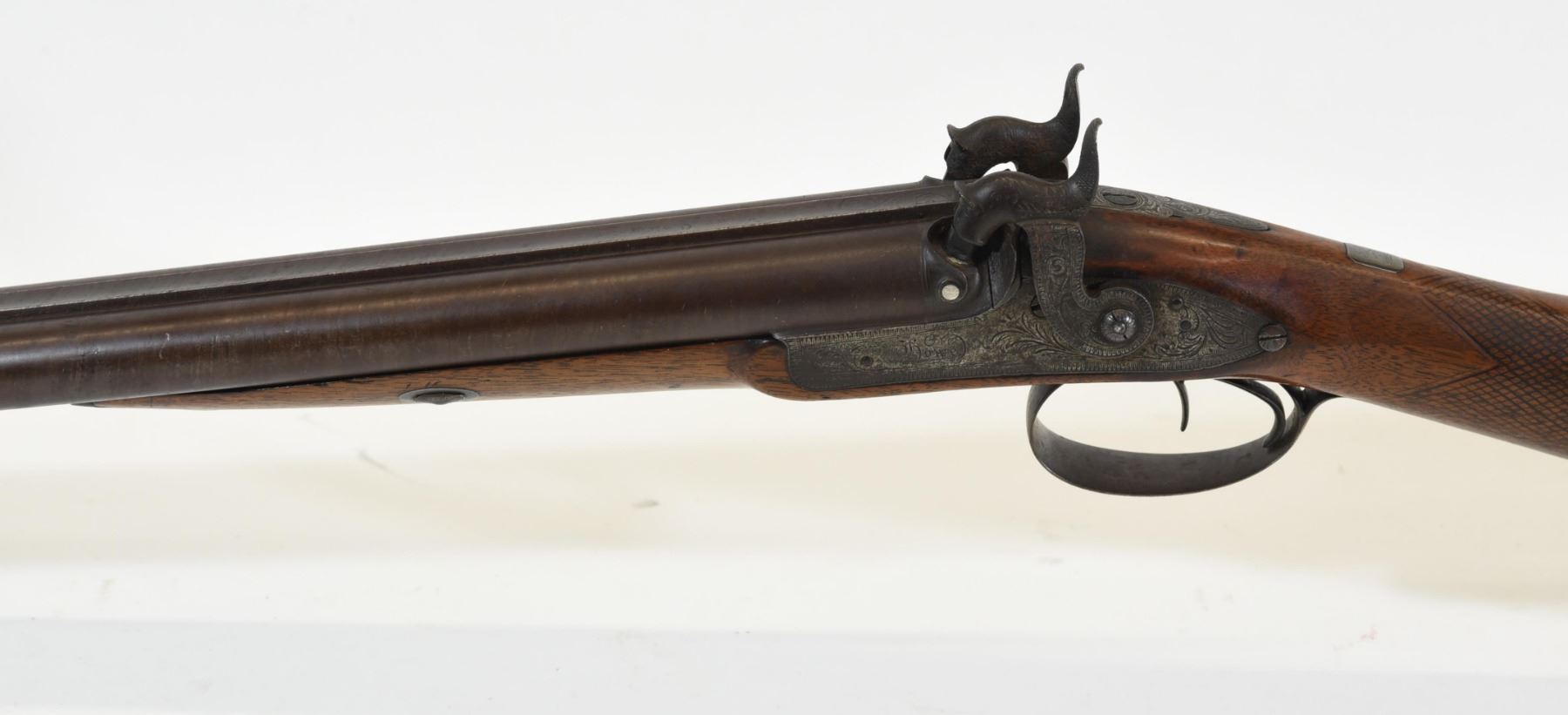 Antique, multi-barrel, 12Ga Percussion, 26" Damascus barrels. No SN. Wood has some dents and scratches, bluing is brown, bores pitted.