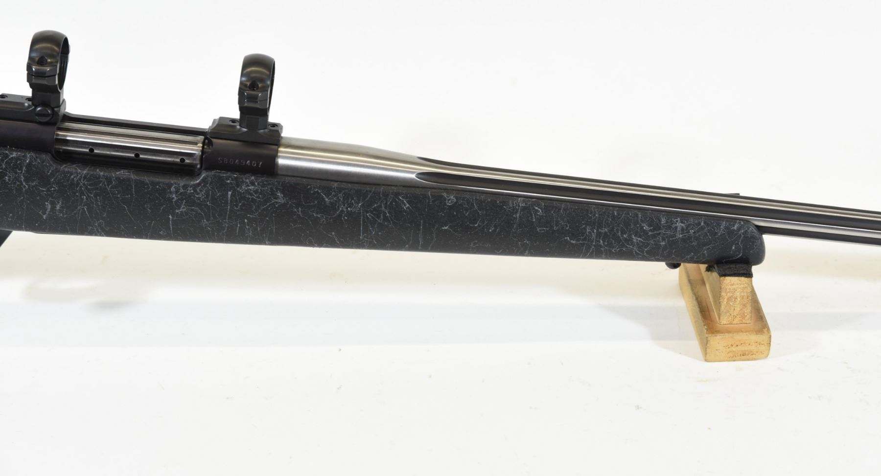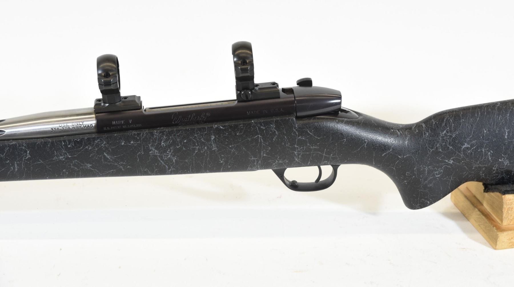 Non-restricted, bolt action, 338-378 Wby Magnum, 28" stainless barrel with muzzle brake. SN SB049407. Comes with scope rings. Said to have been fired less than 20 times. Like new.