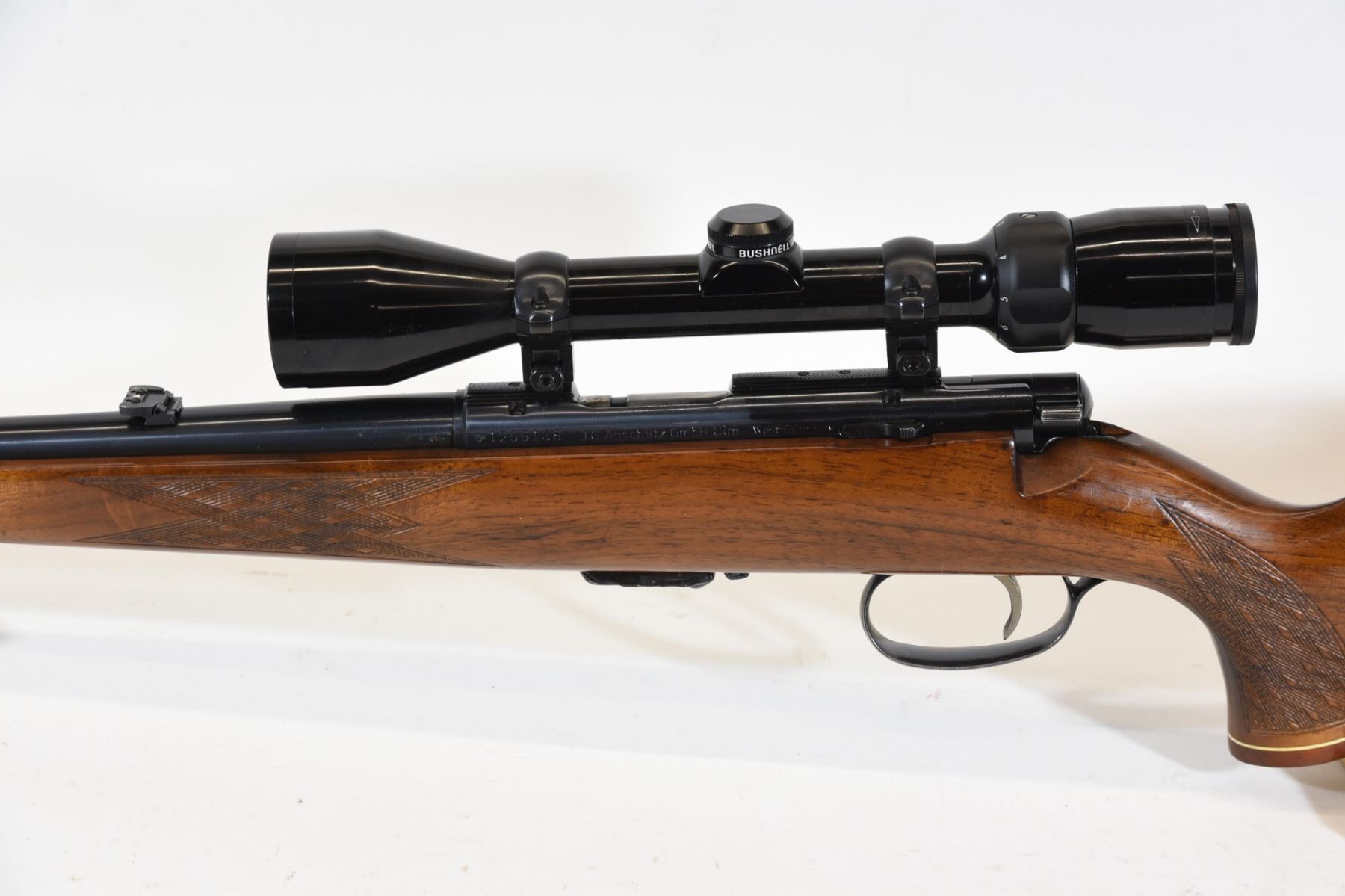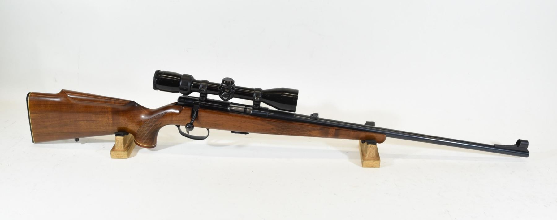 Non-restricted, bolt action, 22 Magnum, 24" barrel. SN 1256146. Wood has some scratches and marks, bluing very good, bore excellent. Comes with Bushnell 3-9 x 40 scope.