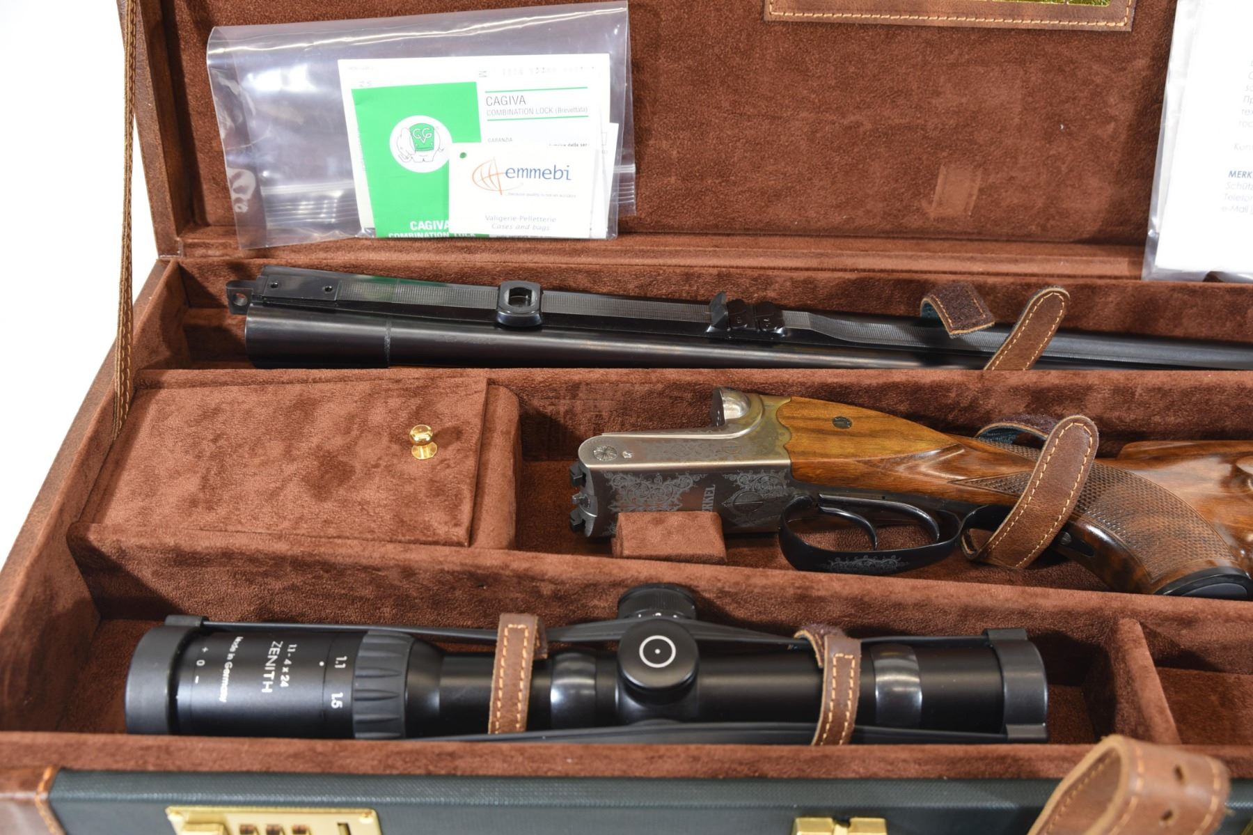 Non-restricted, multi-barrel, 416 Rigby, 23 1/2" barrel. SN A416125. New in takedown lockable case. Comes with Zenith 1.1-4 x 24 Red Dot with QD mounts and sling.