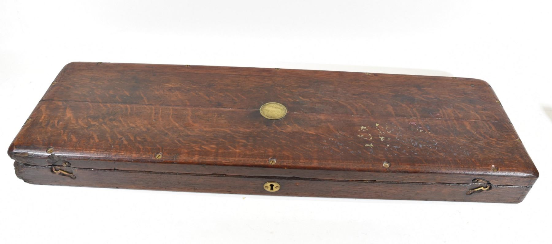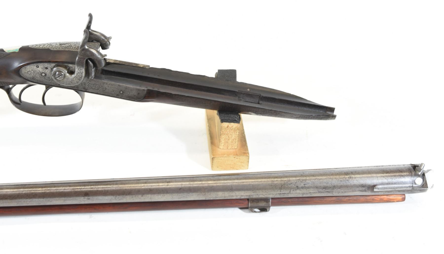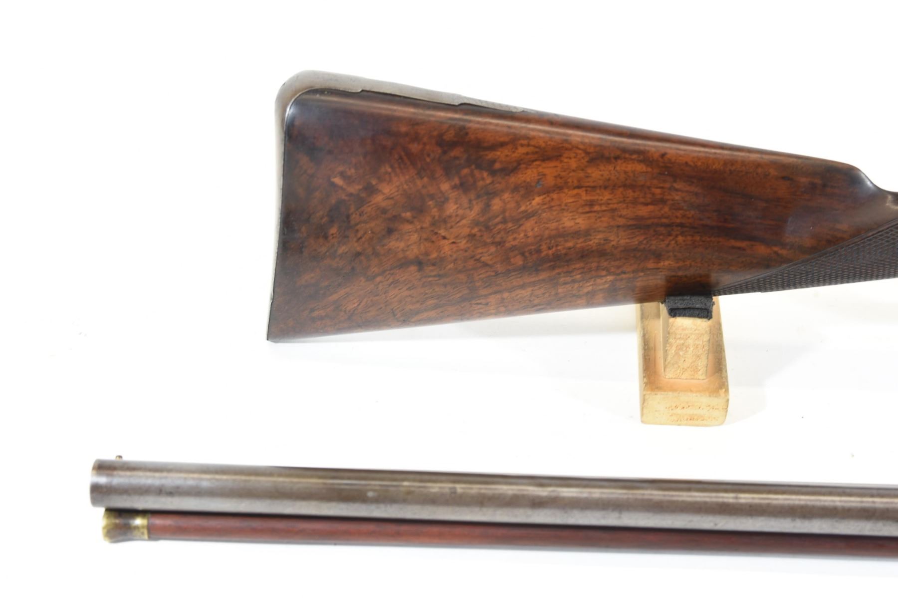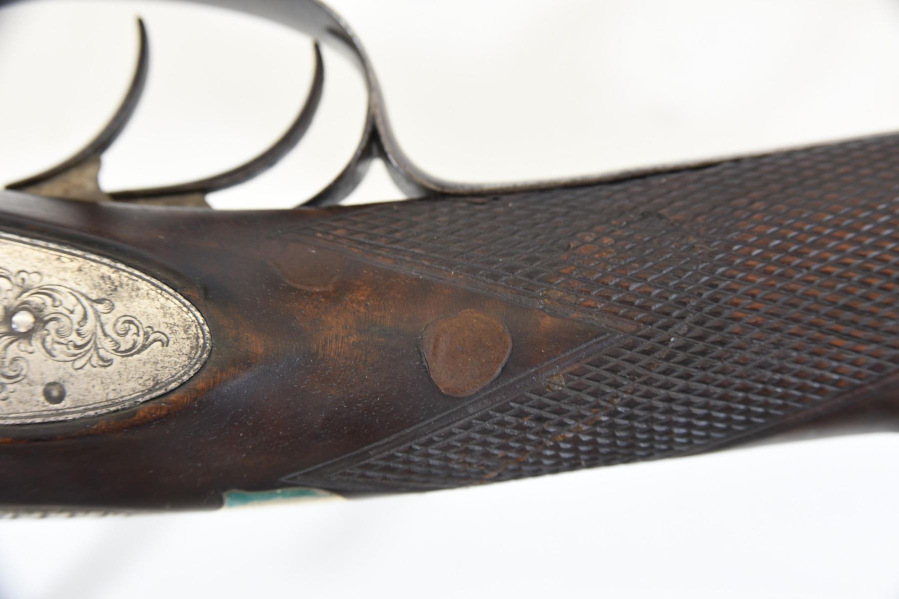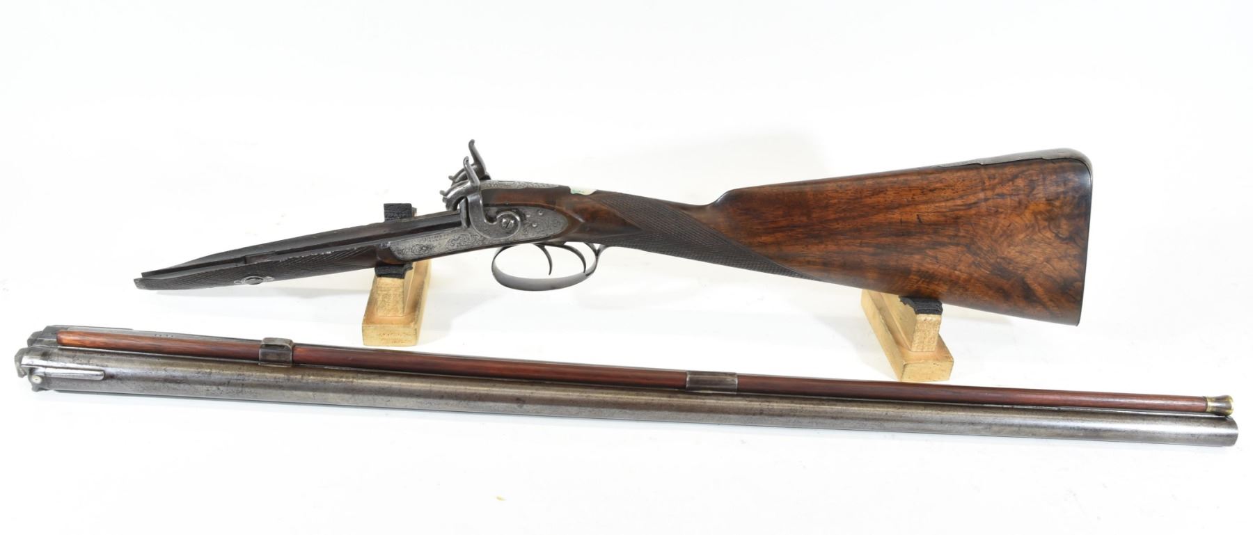 Non-restricted, multi-barrel, 15 bore percussion, 30" barrels, SN 3434. Wood has scratches and a few chips, repaired through wrist, bluing turning brown, bores very good. Original take down wooden case. Comes with cleaning rod, brush, shot & powder flasks.
