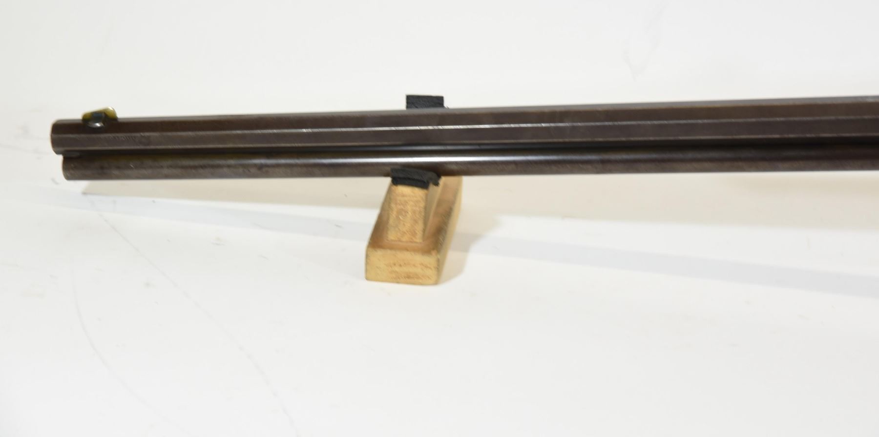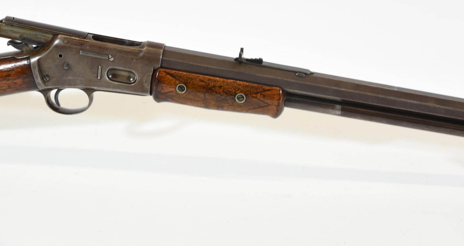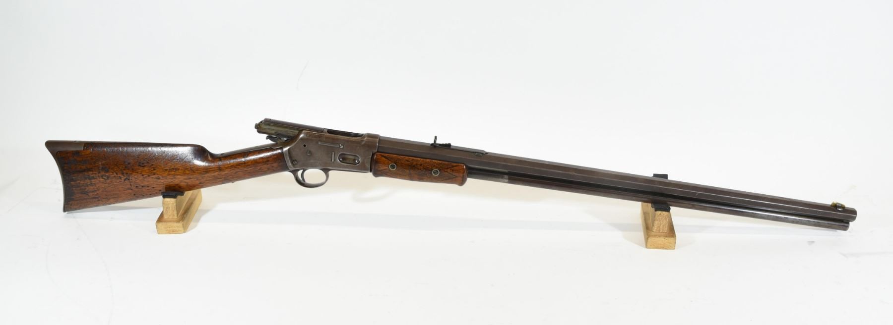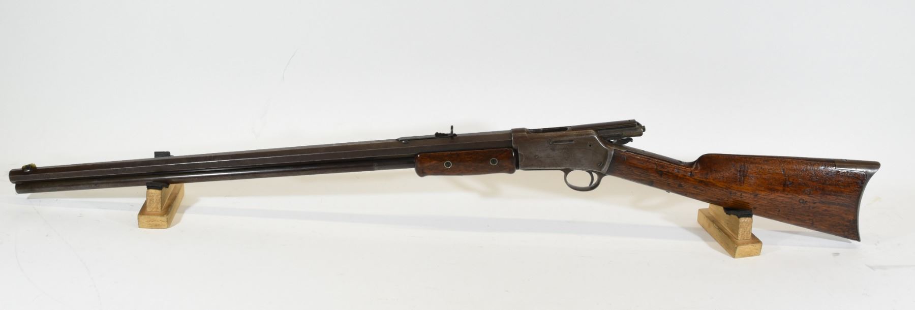Non-restricted, pump action, 38-40 Win, 26" octagonal barrel. SN 23763. Wood refinished with numerous dents, scratches and marks, bluing is brown, bore pitted with prominent rifling.