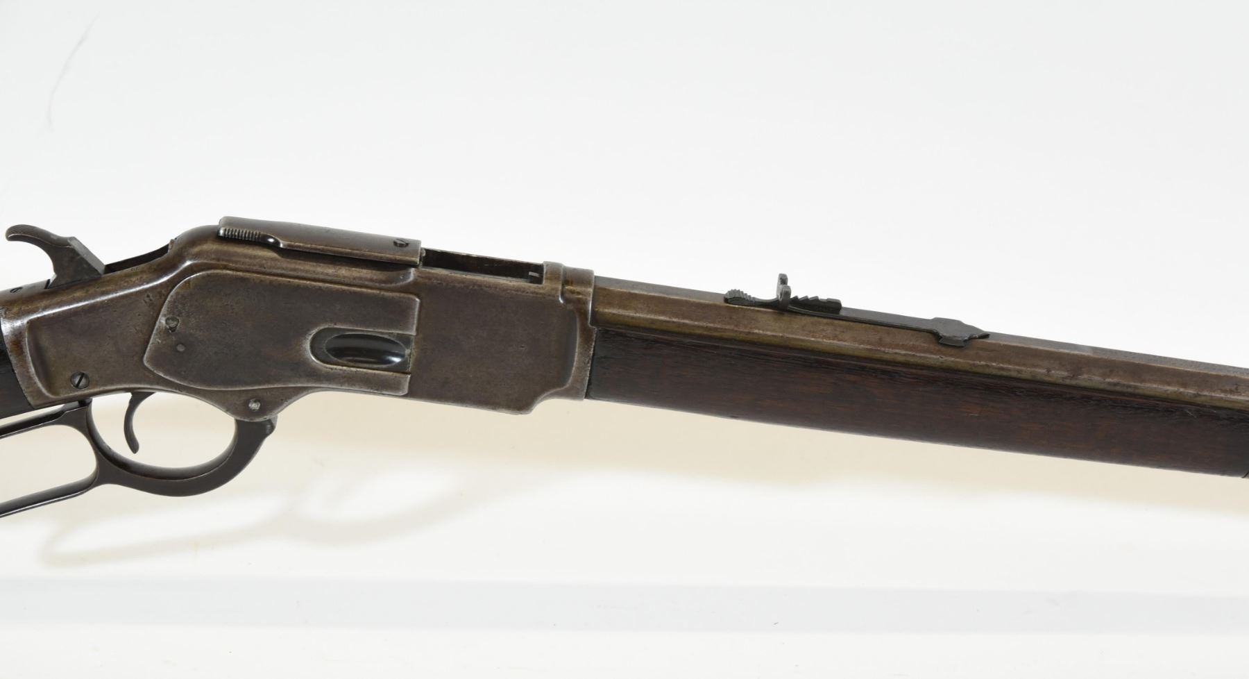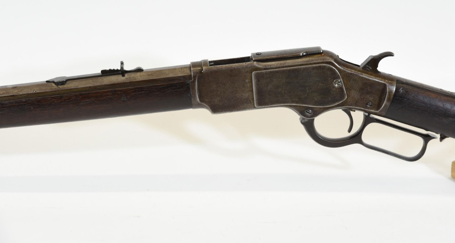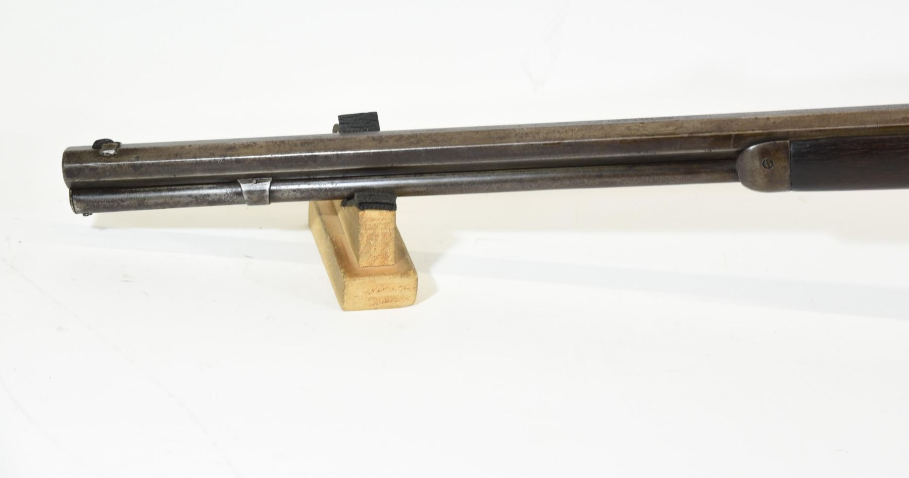 Non-restricted, lever action, 32-20 Win, 24" octagonal barrel. SN 344546B. Wood has dents and a gouge, bluing is brown, bore pitted, rifling barely evident.