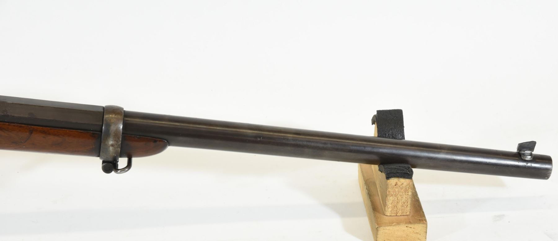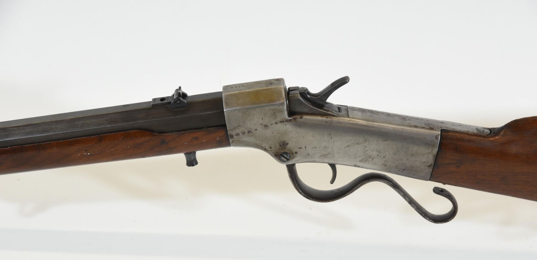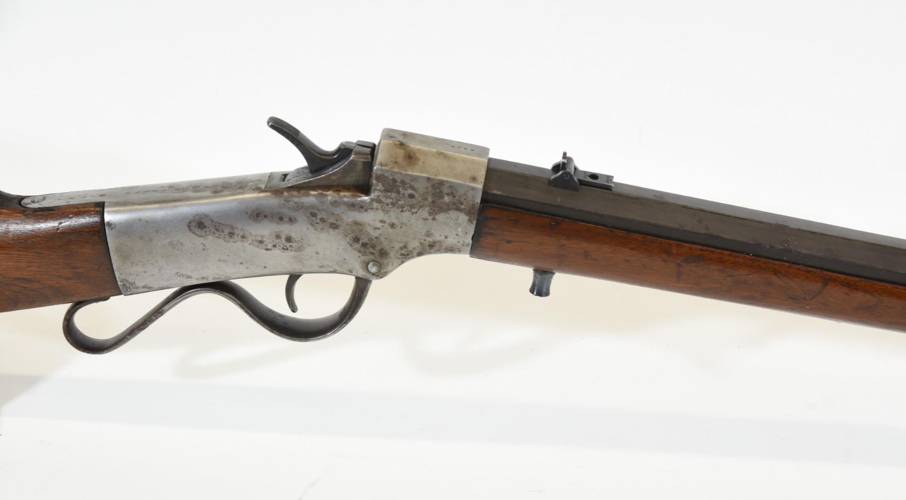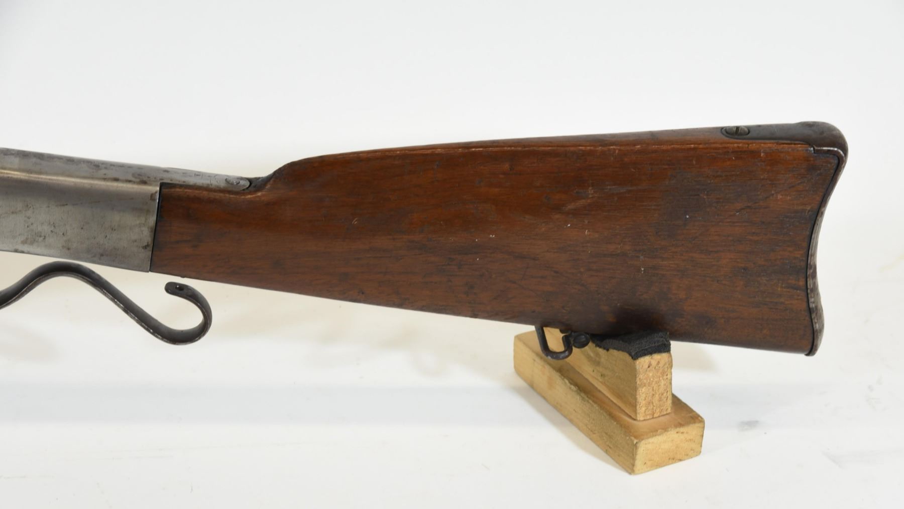 Antique, single shot, 44 RF, 22" octagonal barrel. SN 4806. Wood forearm has a large chip missing, bluing is brown, bore is pitted and rifling prominent. Front sight and tang screw not original. Manufactured by Merwin & Bray Agts, New York.